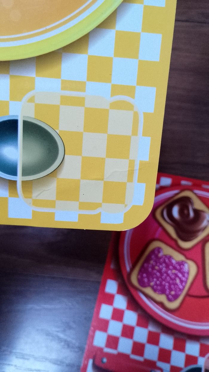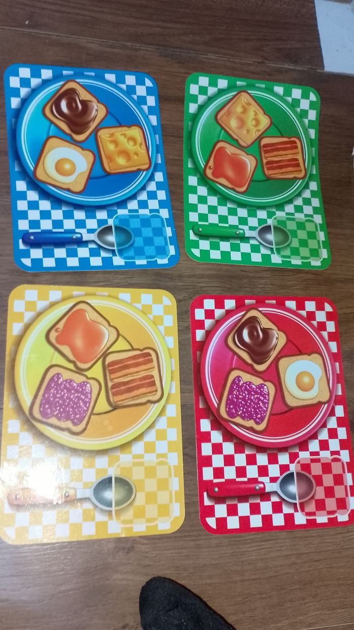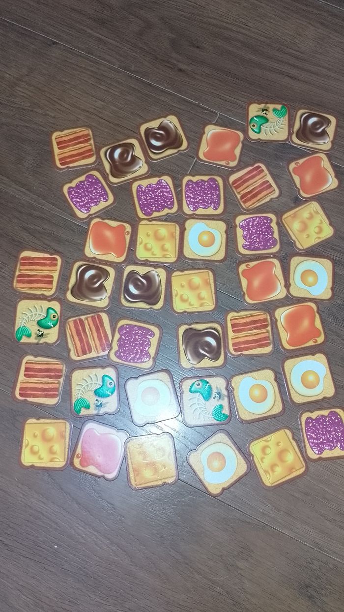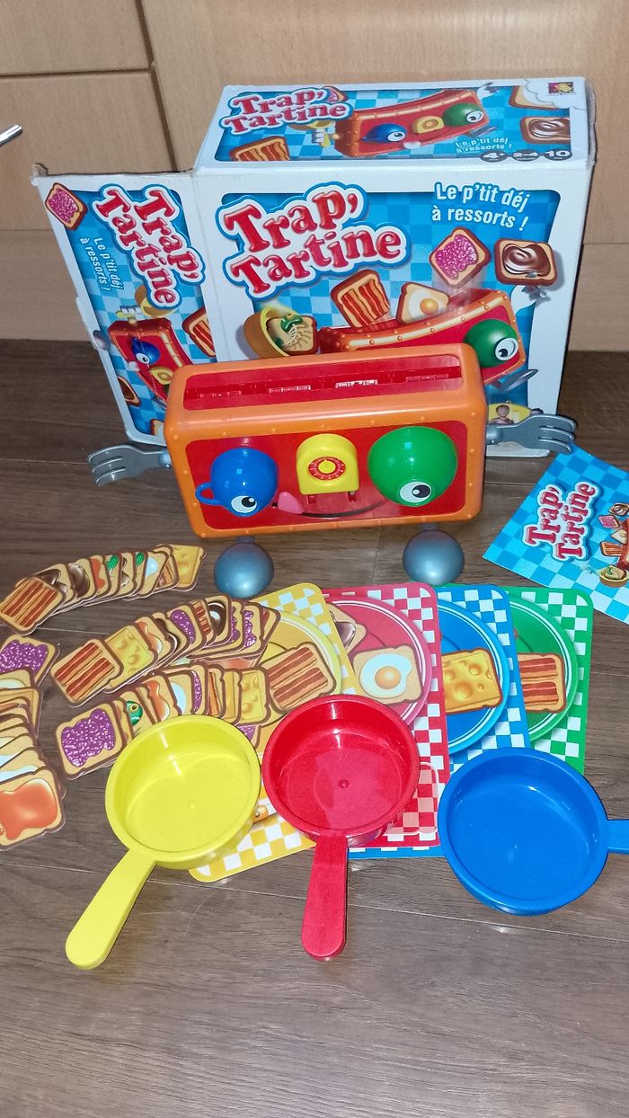 Trap tartine Asmodee complet Attrape les tartines au vol... et remplis ton assiette aves les bonnes tartines! pas de bol t'as attrapé le poisson pourri, rends une tartine! si ton assiette est la plus remplie, tu as gagné! 4ans et + pour 2 à 4 joueurs durée 10 min jeu complet en bon état dans l'ensemble boite en bon état