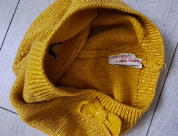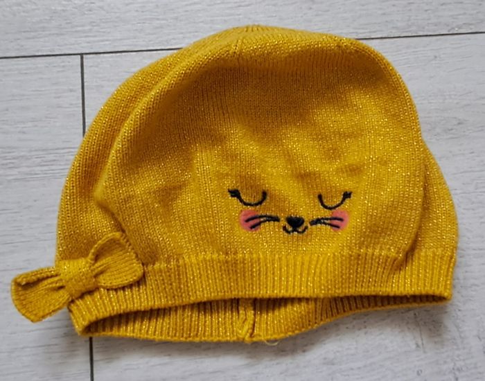 * Le troisième béret jaune pailletté avec yeux et moustaches de chat et petit nœud de la marque Du Pareil Au Même.