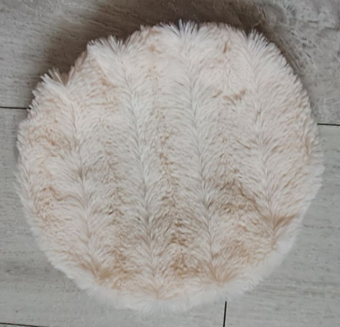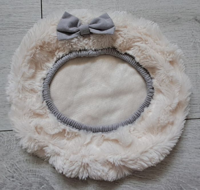 * Le quatrième béret en fausse fourrure blanche avec liseret et petit nœud gris.
