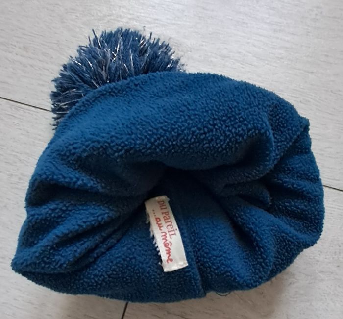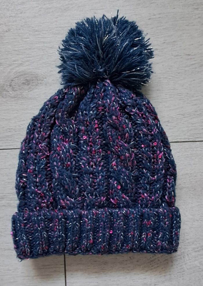 * Le deuxième bonnet bleu marine à paillettes roses avec pompon surblebhaut du bonnet de la marque Du Pareil Au Même.