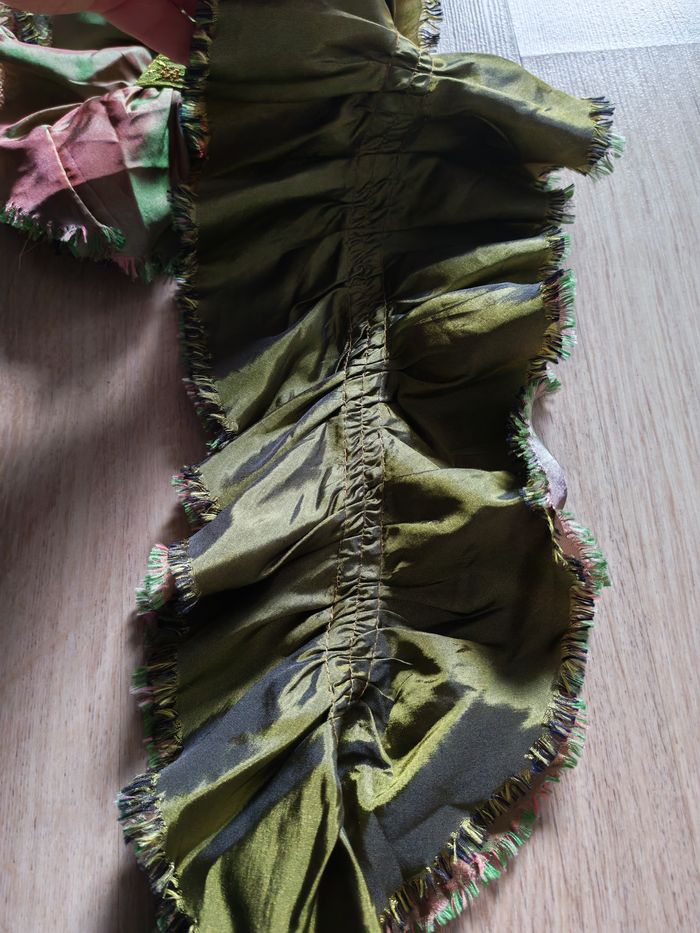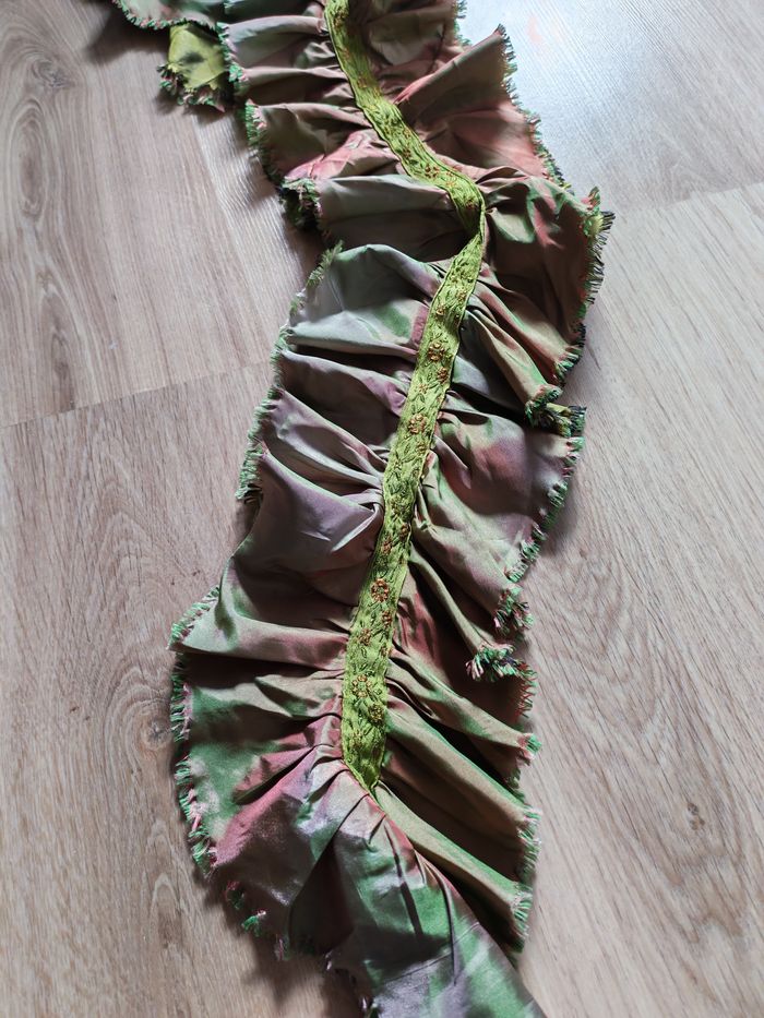 Echarpe froufrou ou à volants caméléon vert rose, en très bon état, composition : 60% polyester, 40% polyamide. Mesures : Longueur : 133 cm Largeur : 15 cm Poids : 46g