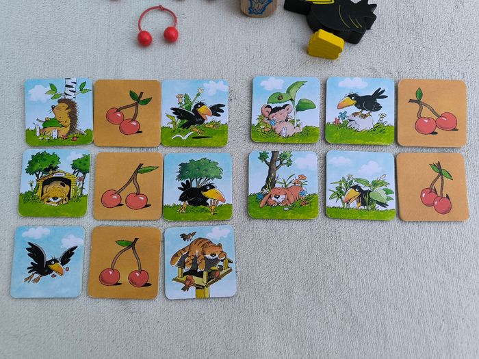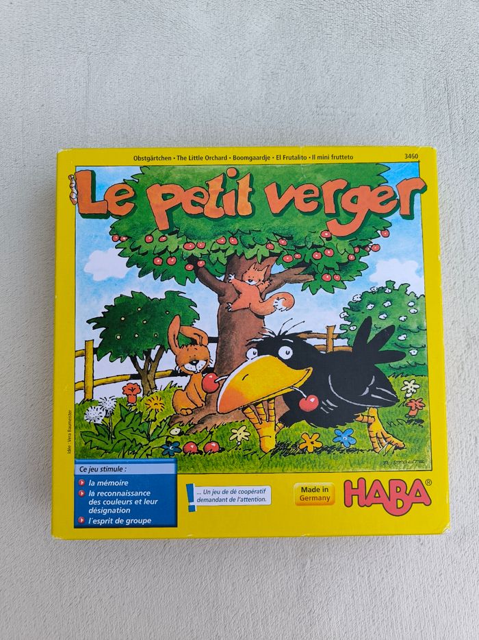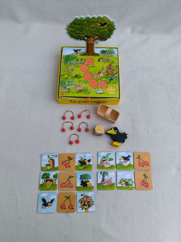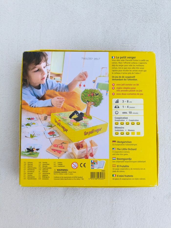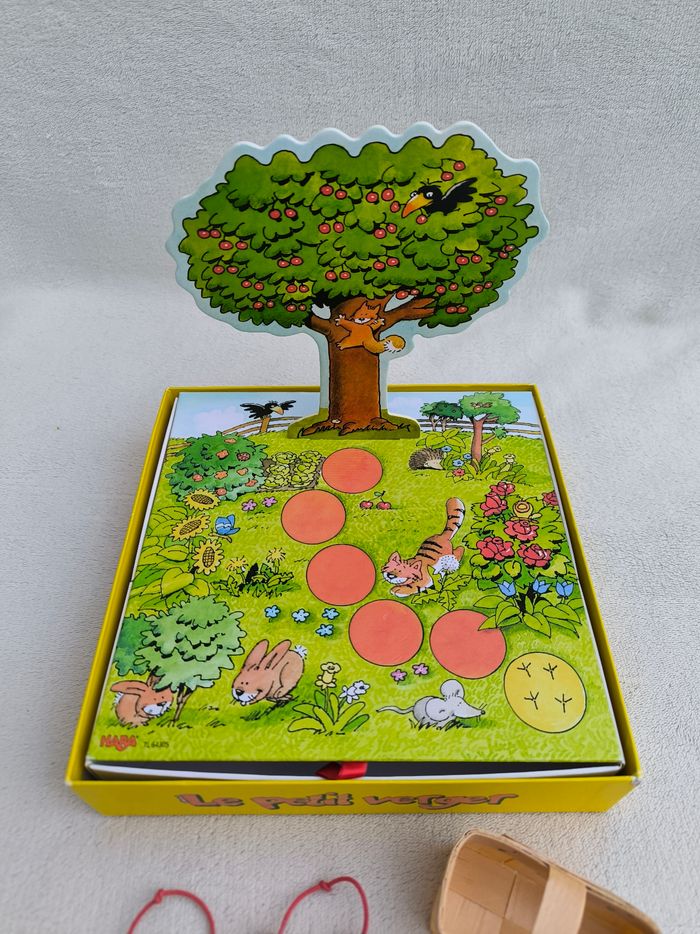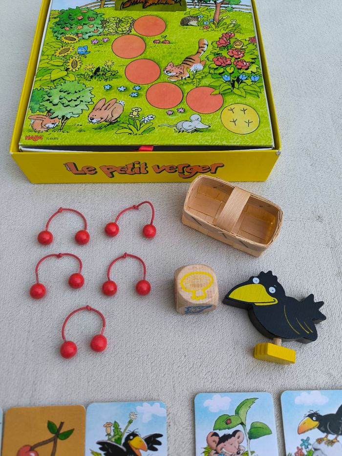 Jeu de société en bois Le petit verger Marque Haba À partir de 3 ans • Jeu coopératif, 1 à 4 joueurs • 5 paires de cerises, 15 cartes-fleurs • 1 plateau avec arbre en 3D, 1 corbeau, 1 panier à fruits, 1 dé • Notice manquante, plateau rescotché sur les côtés Complet En très bon état #evelyne_jeux