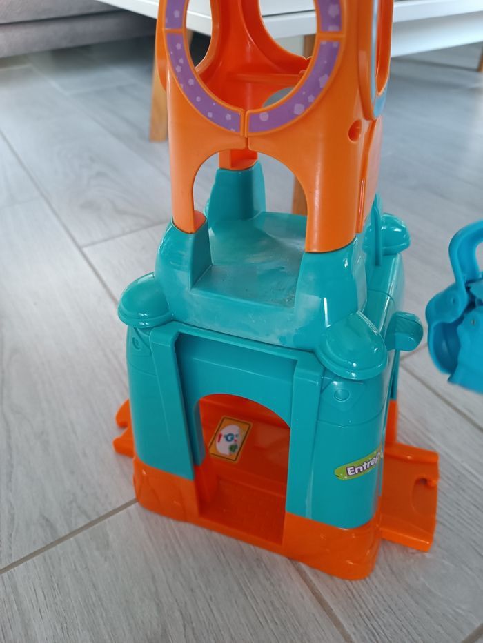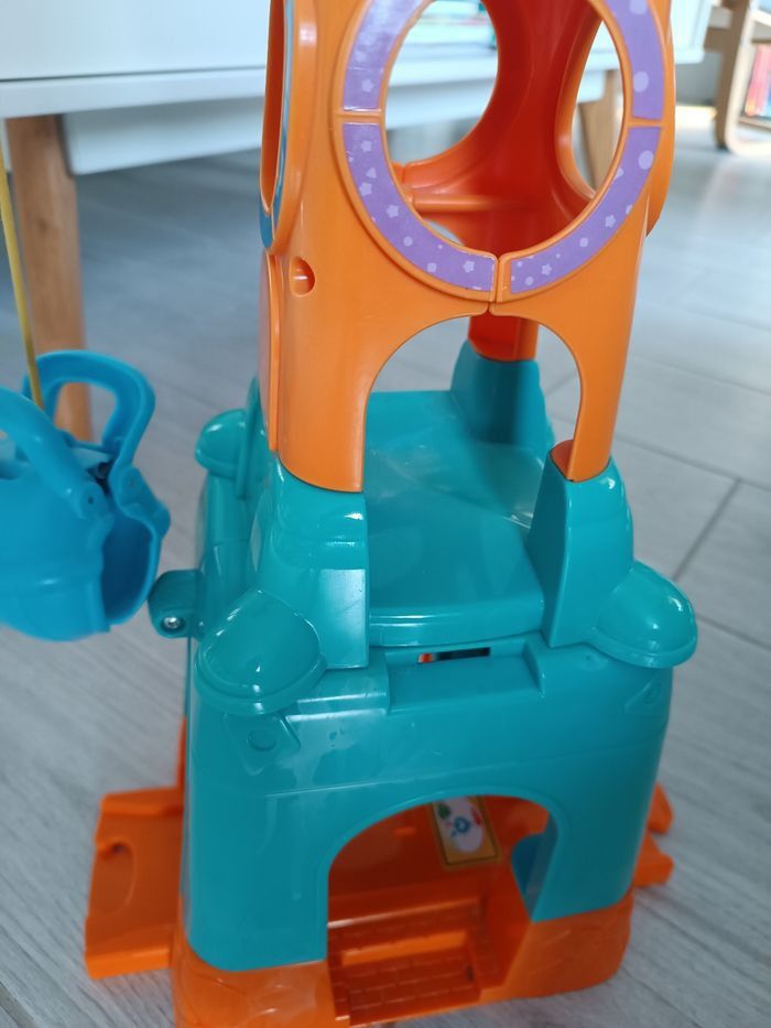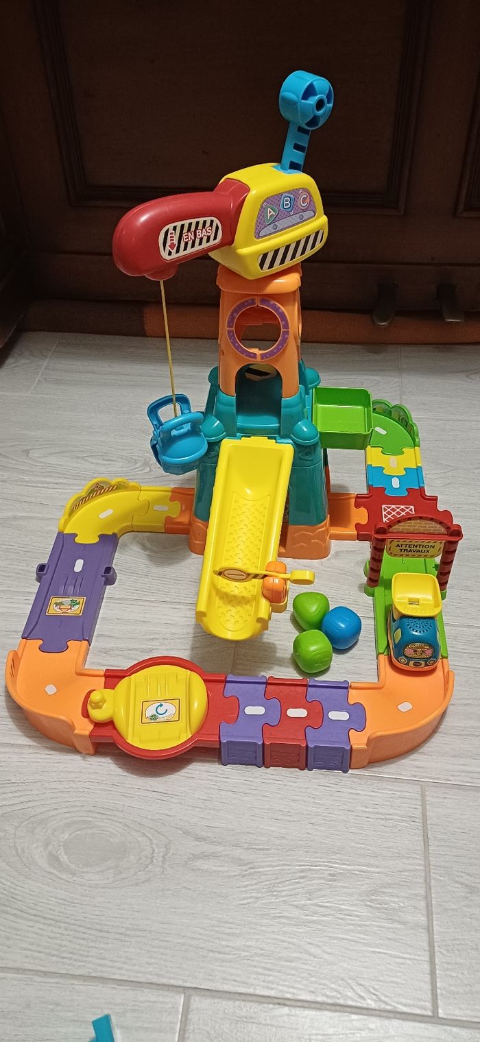 Pleins d'éléments à manipuler : grue, disque tournant, toboggan, zone de chargement...