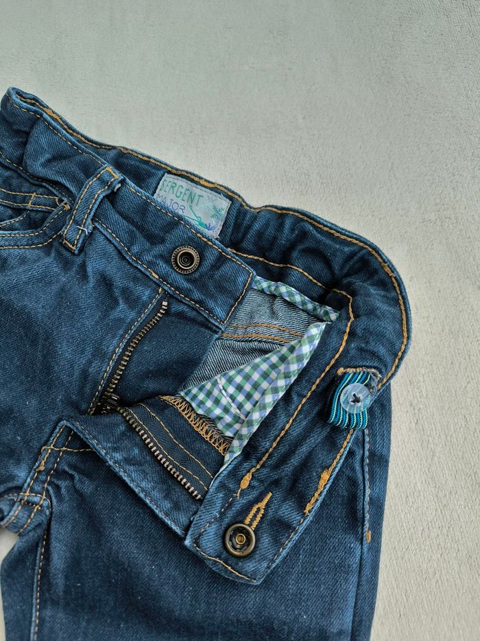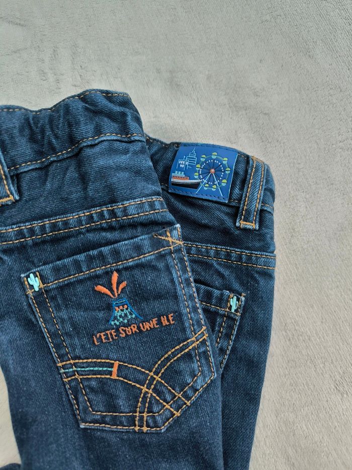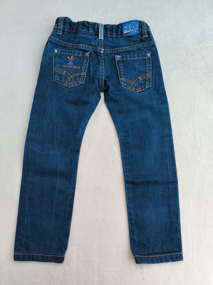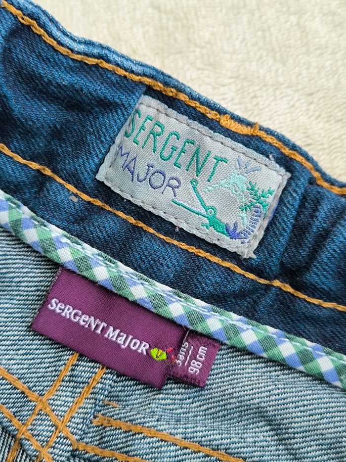 Pantalon / Jean Marque Sergent Major Taille 3 ans, 98 cm • Coloris bleu • Inscription brodée "L'été sur une île", pin's cactus • Fermeture par fermeture éclair et pression • Taille élastique ajustable • 4 poches • Coton • Légèrement abîmé au niveau des fesses, genoux légèrement blanchis En très bon état #evelyne_garcons_3ans #evelyne_garcons