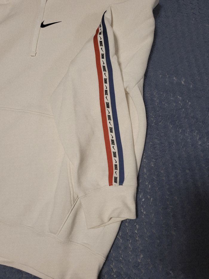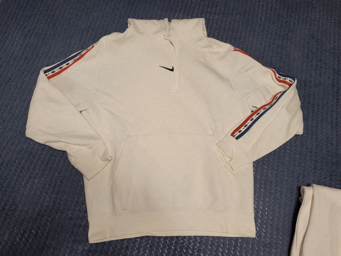vends cet ensemble (sweat + jogging) Nike blanc pour homme de taille S. Bandes bleues, blanches et rouges sur les côtés. N'hésitez pas à me contacter pour plus d'informations ou de photos.