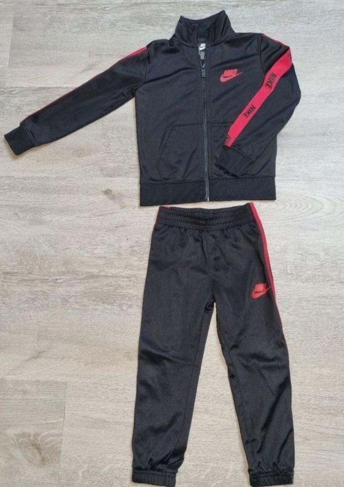Magnifique ensemble survêtement Nike pour enfant, en coloris Noir avec des bandes contrastantes et des logos Rouges vifs.
