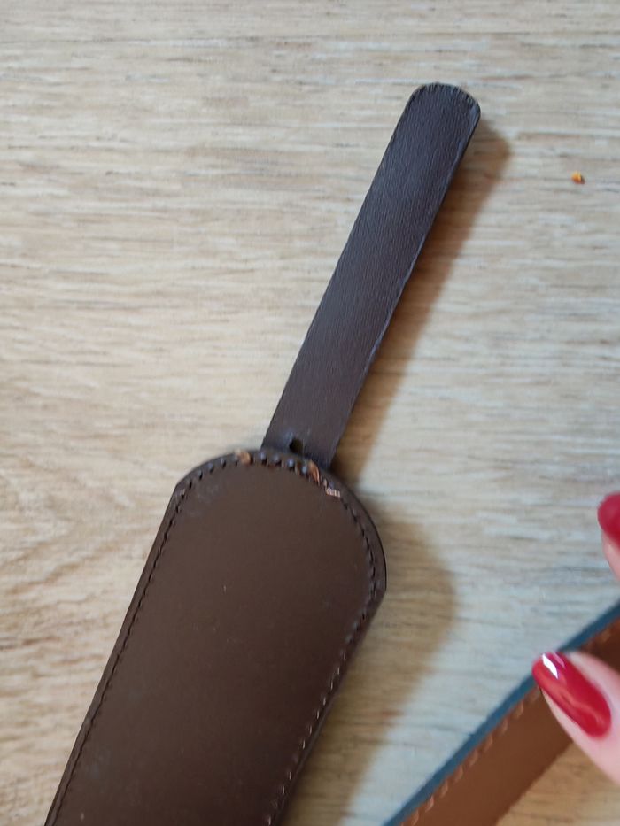Belle ceinture beige et marron large originale en synderma taille 38, made in Belgique. Synderma - le cuir recyclé ou synderme est une matière écologique sa fabrication n'est pas toxique et permet une réutilisation des chutes de matières. Ceinture est en très bon état, large et fine à son extrémité qui s'insère dans la les fins passant et boucles agentés de structure viellie, belle pièce. Mesures : Mesures : Longueur totale : 88 cm Largeur : 5 cm Longueur jusqu'au 1er trou (au plus serré) : 74 cm Longueur jusqu'au dernier trou (au plus large) : 84 cm Espace entre tout les trous : 2,5 cm (il y en a 5) Poids : 180g