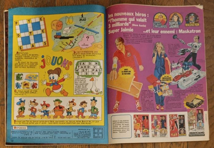 Ancien magazine Journal de Mickey N°1323 Année 1978 Avec dépliant double page Manuel Castors juniors ⚠️ Magazine abîmé : Tranche usée Pages cornées Couverture arrière déchirures Cf photos Ce magazine comprend les pages suivantes : Bd Anciennes publicités : Barbie Lego Lundby Meccano l'homme qui valait 3 milliards Group action joe Atelier 2000 Six de savoie De nombreux anciens magazines et articles vintage disponibles, N'hésitez pas à regarder mes autres annonces