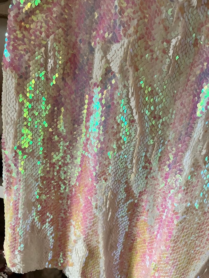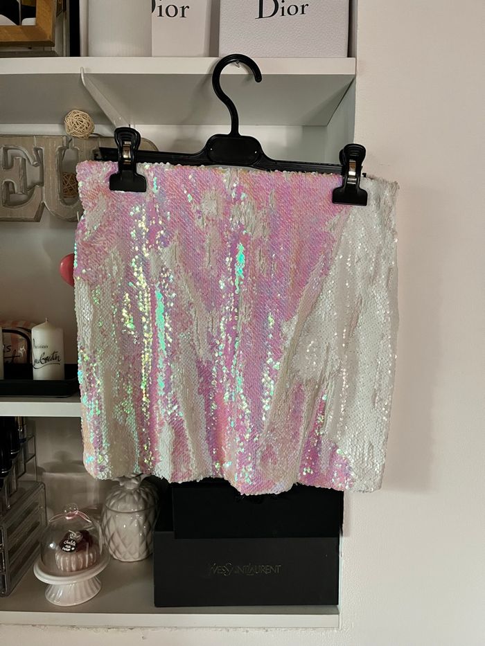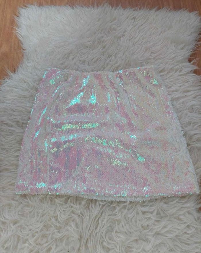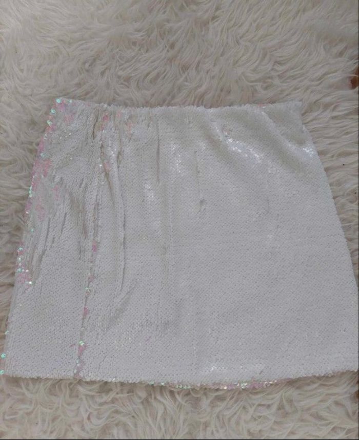 〰️ Mini jupe avec sequins réversibles blanc irisés, idéale pour les fêtes