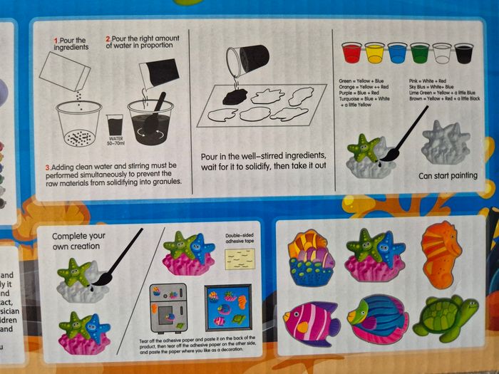 Comprends: modéles de mélange de motifs , 1 spatule , 2 masses , 2 pinceaux + peintures , bol , ruban adhésif double face 6 feuilles ,