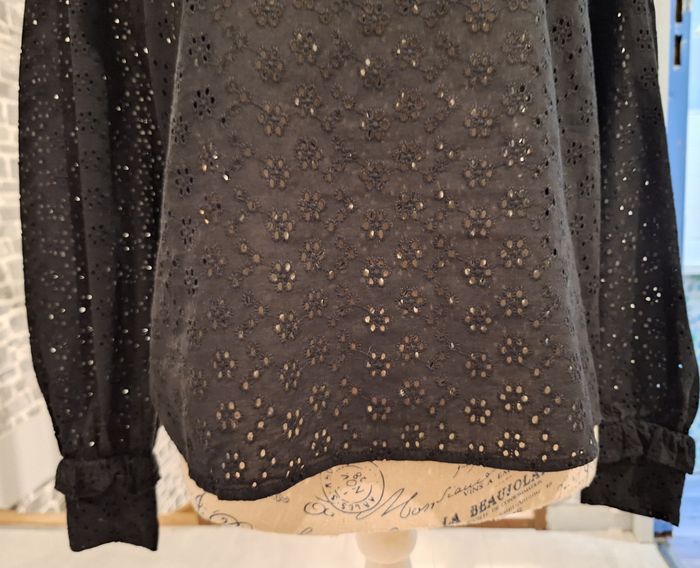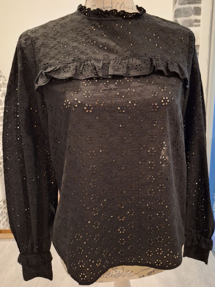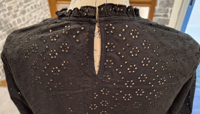 Jolie blouse toute ajourée, deux boutons à chaque poignet, une agrafe à la nuque. Petits volants sous le cou et aux poignets.