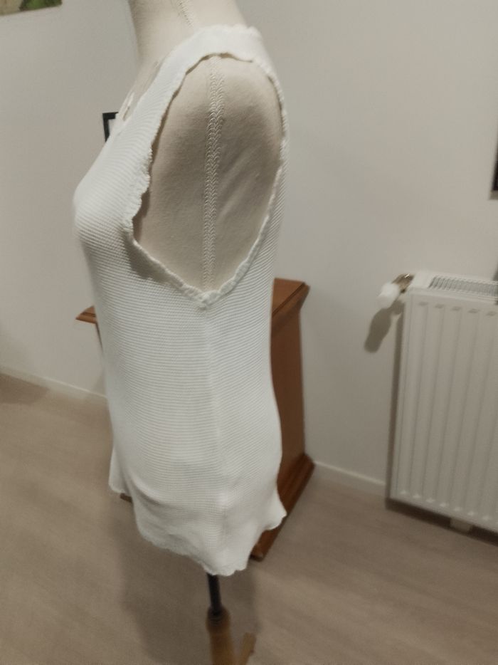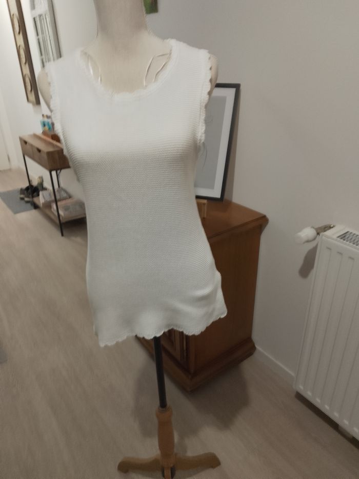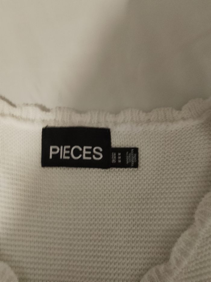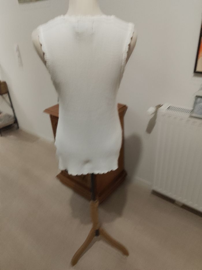 Pull débardeur blanc en coton, sans manches, raz du cou, bordures façon dentelles, cordons de maintien aux épaules, toutes saisons toutes saisons, femme, hauteur totale: 63 cm, aisselle à aisselle : 40 cm, largeur base: 45 cm, '' PIECES '', T: M/38/40, porté quelques fois, aucun accrocs, aucune tâches, Lavé, non repassé), très bon état, prêt à porter.