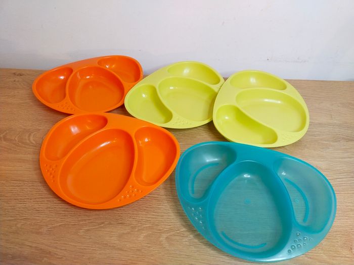 Lot de 5 assiettes de couleur en plastique pour enfants/bébés à compartiments Très bon état Marque Tommee Tippee 3e le lot D'autres accessoires pour le repas à vendre (couverts, bavoirs...)