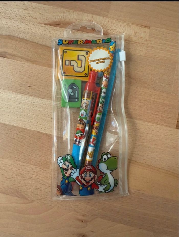 Comprend une trousse en plastique, un stylo, un crayon de papier, une règle de 15cm, une gomme et un petit taille crayon