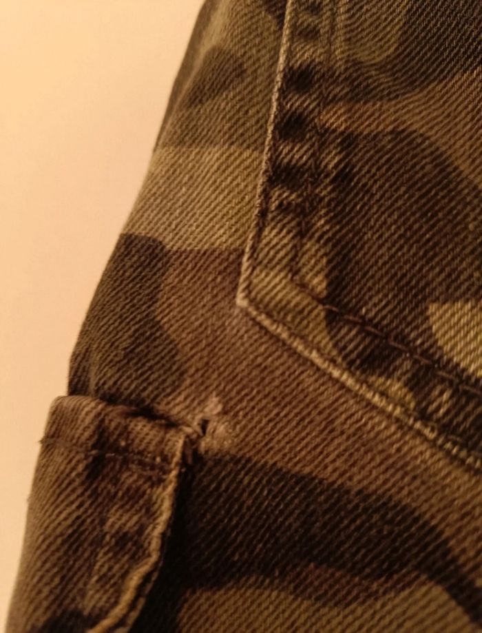 Marque : KIABI Taille : XS (Extra Small) Couleur : Imprimé camouflage (Vert, Brun et Noir). Style : Mini-jupe coupe droite/cargo, décontractée. État : Occasion. DÉFAUT À NOTER : Petit trou à proximité d'une poche (voir photo). #oceaneplomionvetementfemme34