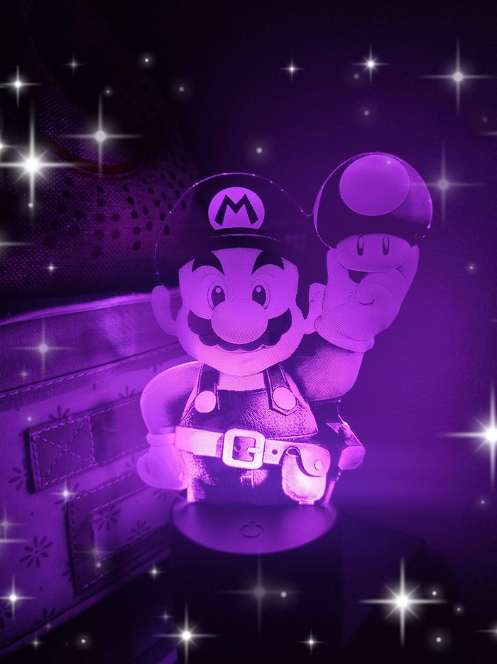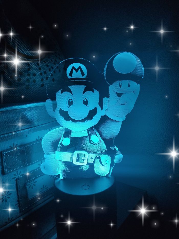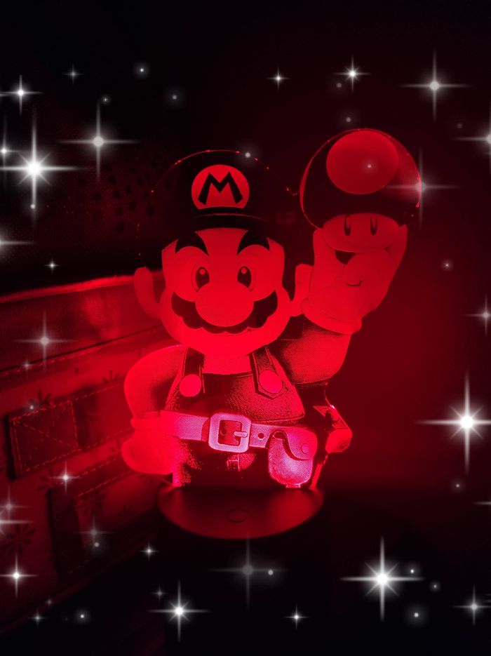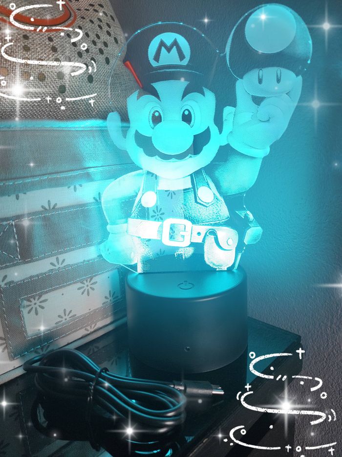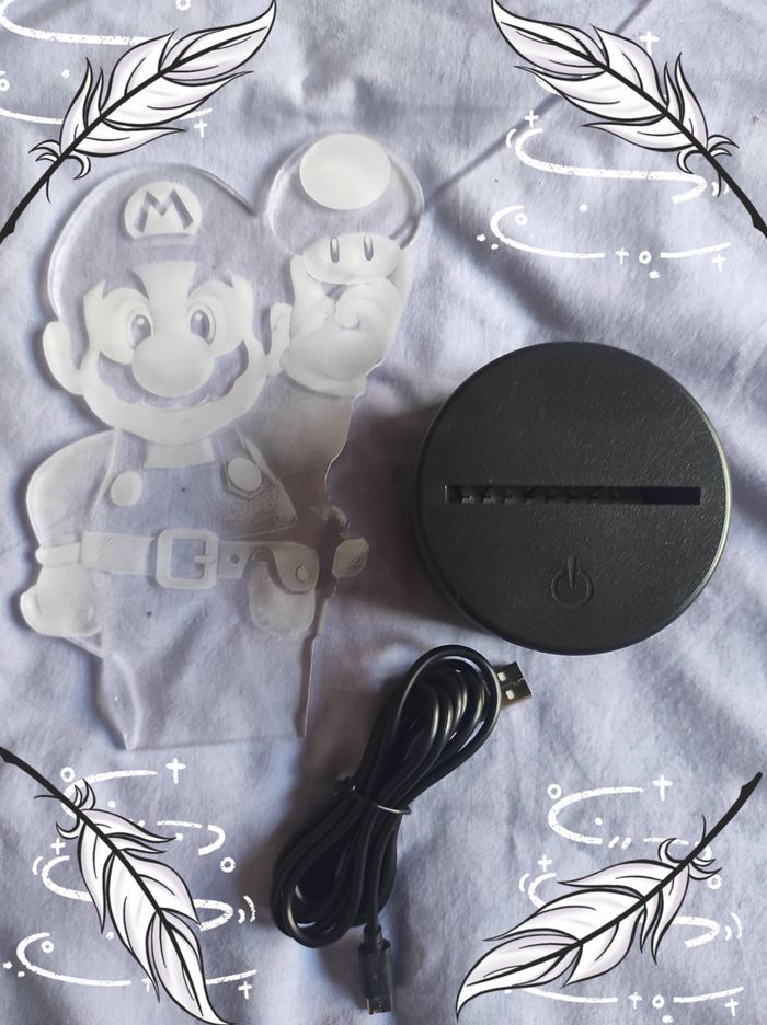 🍄 Lampe d'ambiance 3D illusion à LED représentant le personnage de Mario tenant un champignon Power-up. Idéale comme veilleuse, lampe de bureau ou élément de décoration pour une chambre de fan de Nintendo/Super Mario Bros. La lampe change de couleur (rouge, bleu, vert, etc. visibles). Comprend la base noire et le câble USB. 🎨 Colori : Multi-couleurs LED 📏 Taille : Lampe de table ✅ État : Neuf 📦 Envoi : Envoi rapide et soigné / Remise en main propre possible ✨ N'hésitez pas à visiter mon dressing, je vends de nombreux articles !