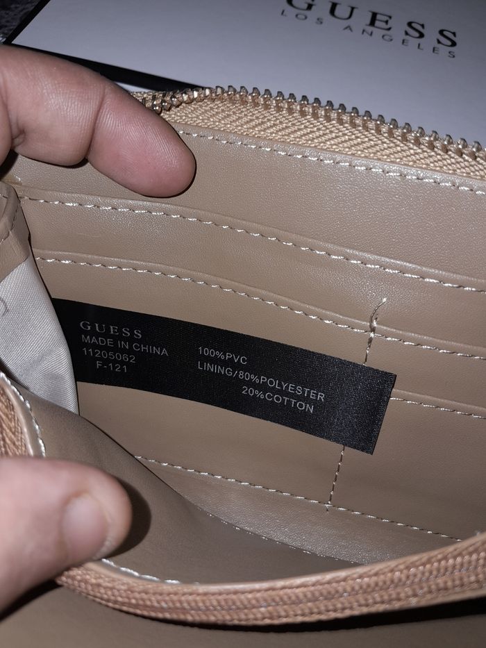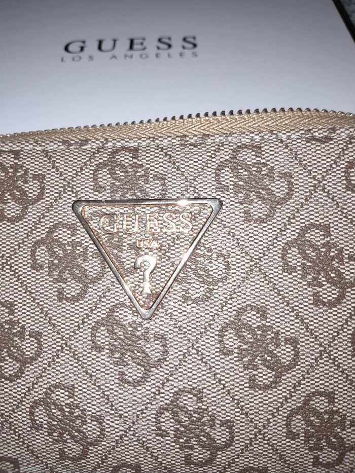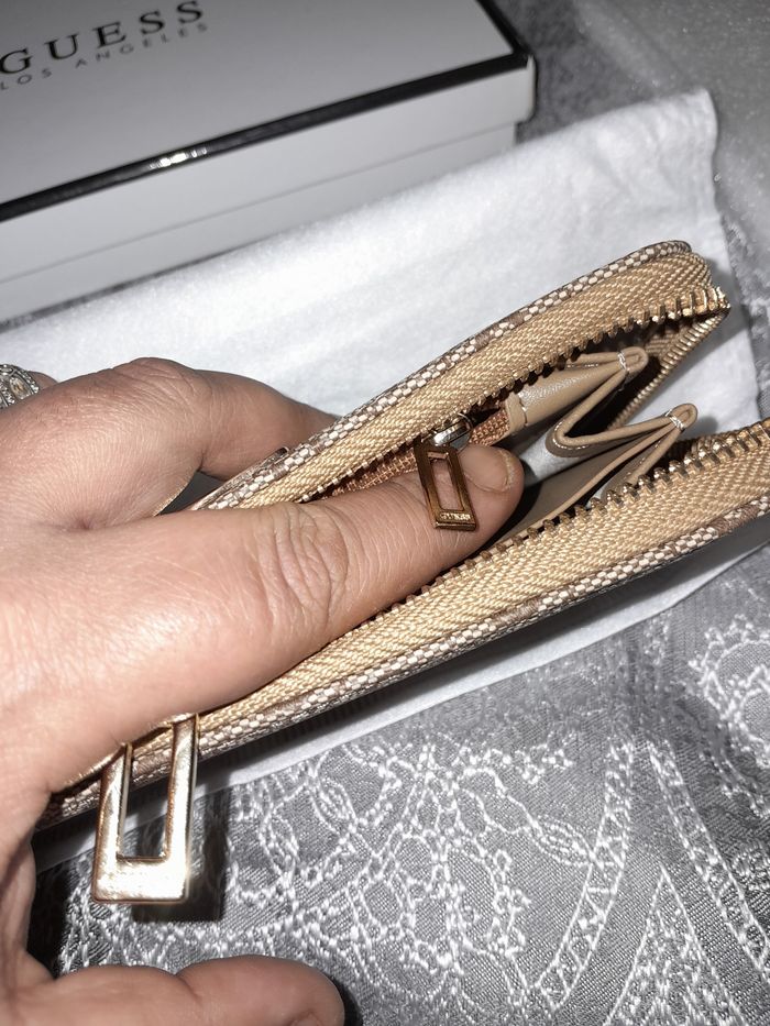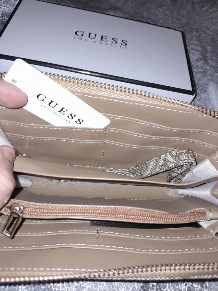 Magnifique porte feuille guess beige et marron et dorée 20x10cm Peut se porter avec bandouillere ou en porte feuille Neuf avec son sac et boîte Idéal pour offrir Acheter 89€