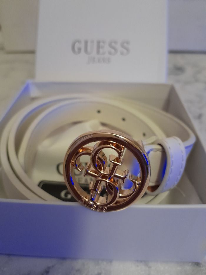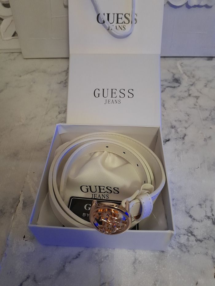 Jolie ceinture guess pour femme balnc et boucle doré 100 cm Toute Neuf Acheter oublier dans mon dressing et est petite maintenant Avec sa boîte ,pochon en tissu carte ,et petit sac cadeau Idéal pour offrir aucun défaut Acheter 89 €
