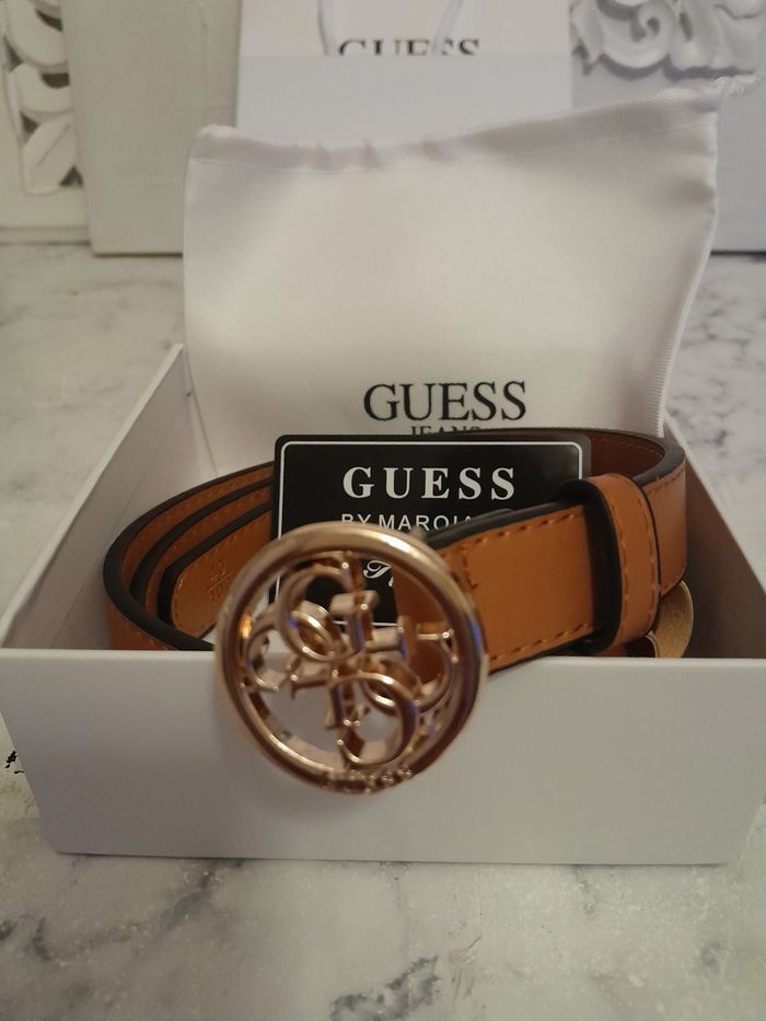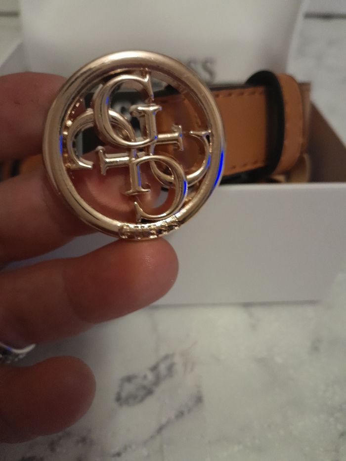 Jolie ceinture femme Guess jeans Kamel et boucle doré 100 cm Avec boite ,pochon en tissu ,carte ,et sac en papier Idéal pour offrir Acheter 90€ à Londres Toute Neuf oublier dans mon dressing et depuis j'ai grossi donc trop petite