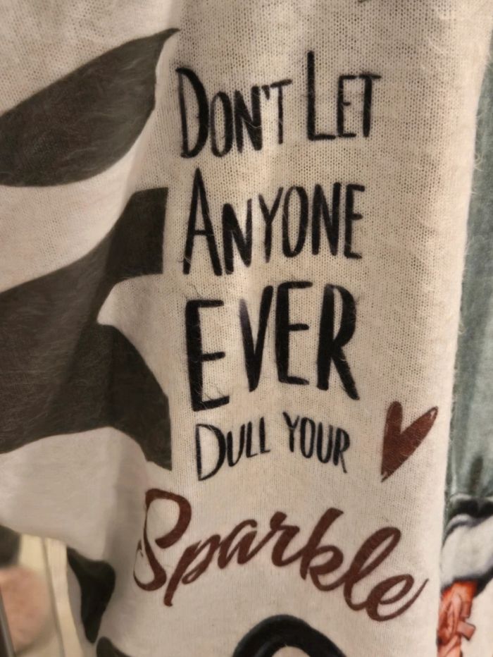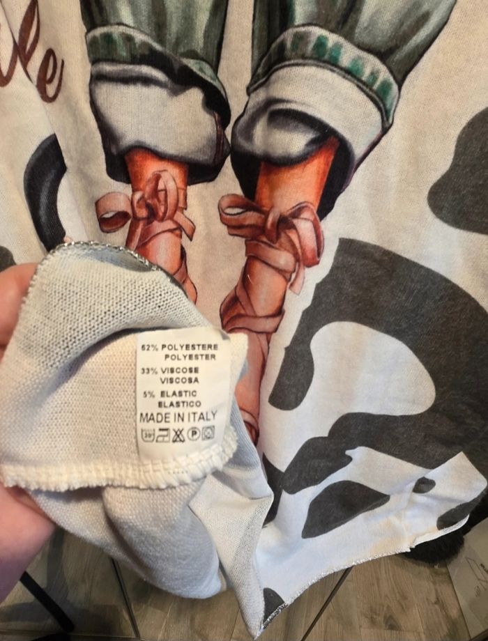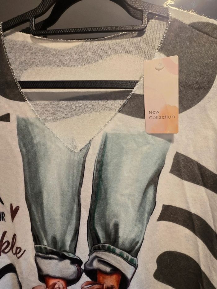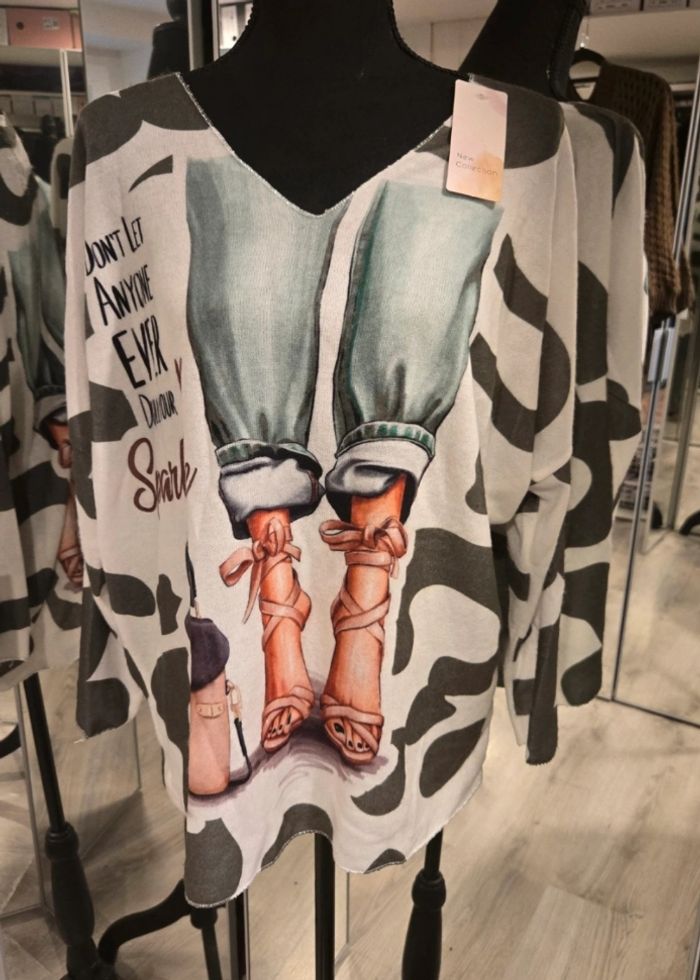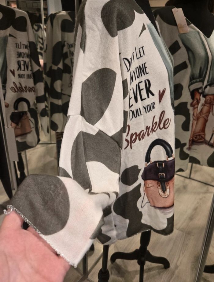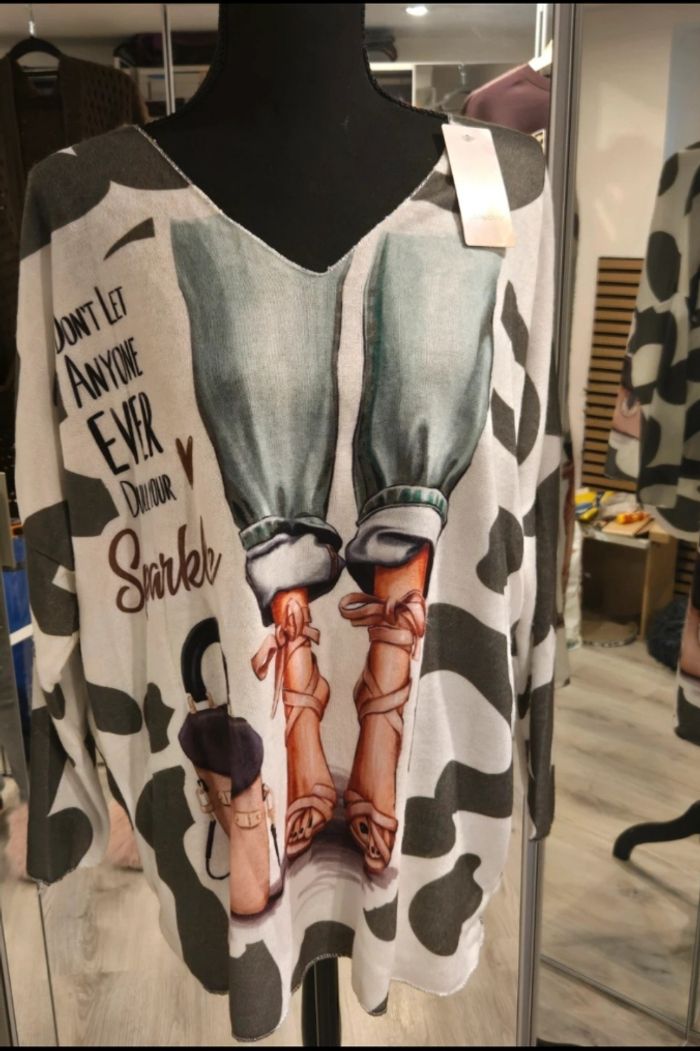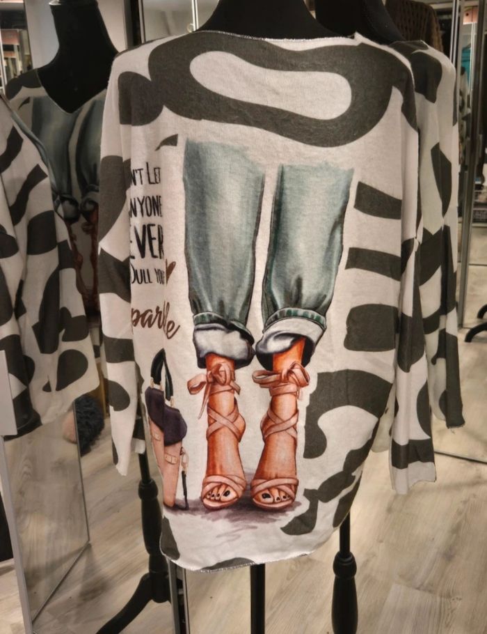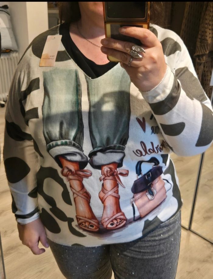 Pull léger à col v kaki et blanc en matière douce et légèrement duveteuse, avec imprimé sandales et sac à main et contour en lurex argenté pour femme. Inscription : Don’t let anyone ever dull your sparkle (ne laissez jamais personne ternir votre éclat). Neuf avec étiquette 🏷. 🇮🇹 Made in Italy. 🇮🇹 Taille : unique pouvant aller jusqu'au 42/44 max. Matières : 62% polyester, 33% viscose et 5% élasthanne. Dimensions : environ 68 cm de long, 70 cm de large sous les bras, 59 cm de large en bas (plus si ouvert), 44 cm de largeur d'épaule à épaule, 34 cm de longueur de manche et 28 cm de largeur d’emmanchure entre l'épaule et l'aisselle. Marque : New Collection. d'échange, merci. Envoi rapide via Mondial Relay.