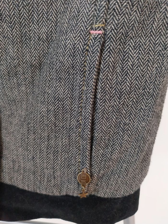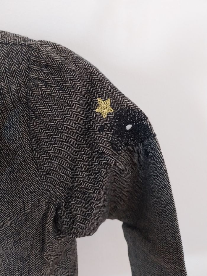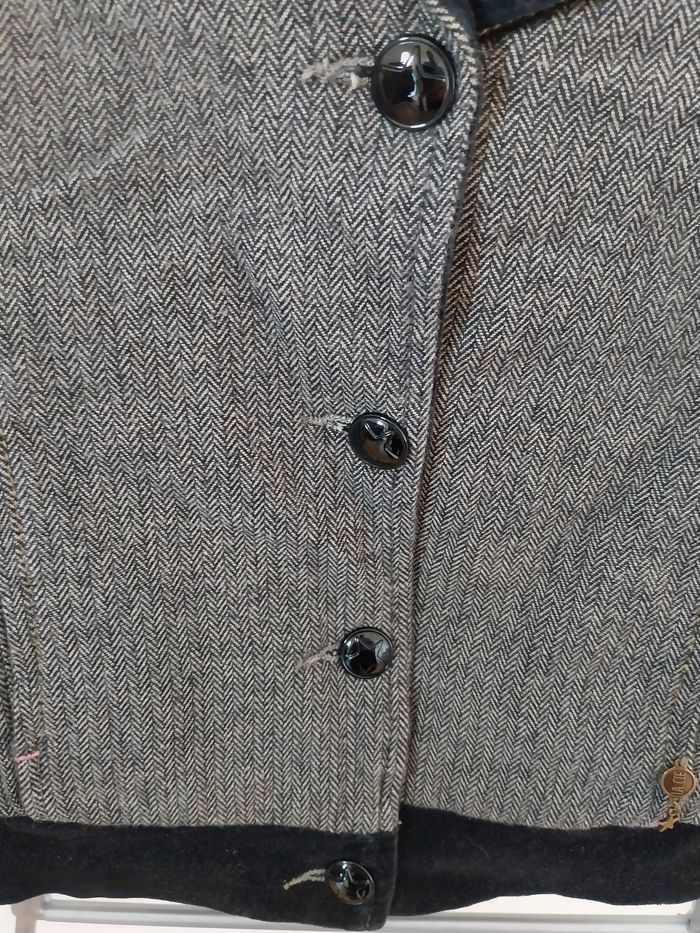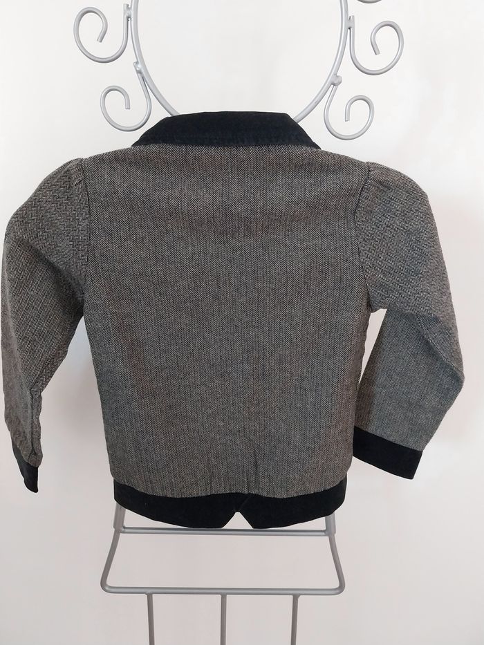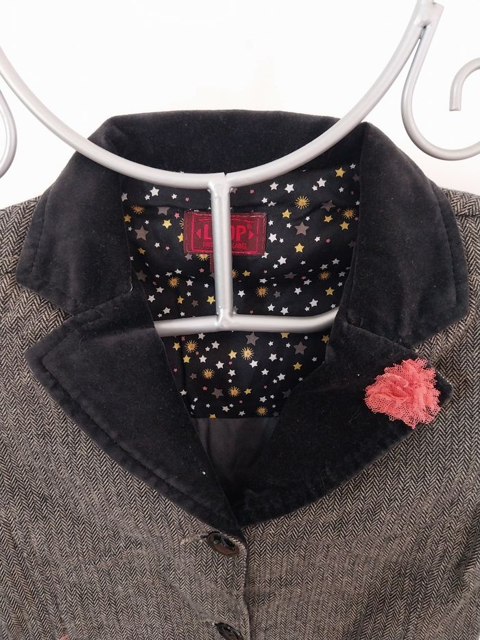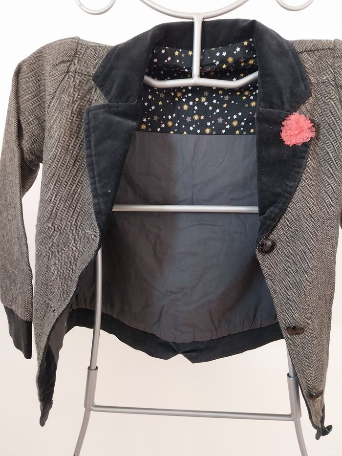 Petite veste grise à chevrons, col et bordures en velours noir pour un petit côté chic, fleur rose relief sur le col, broderies fleurs sur la manche.