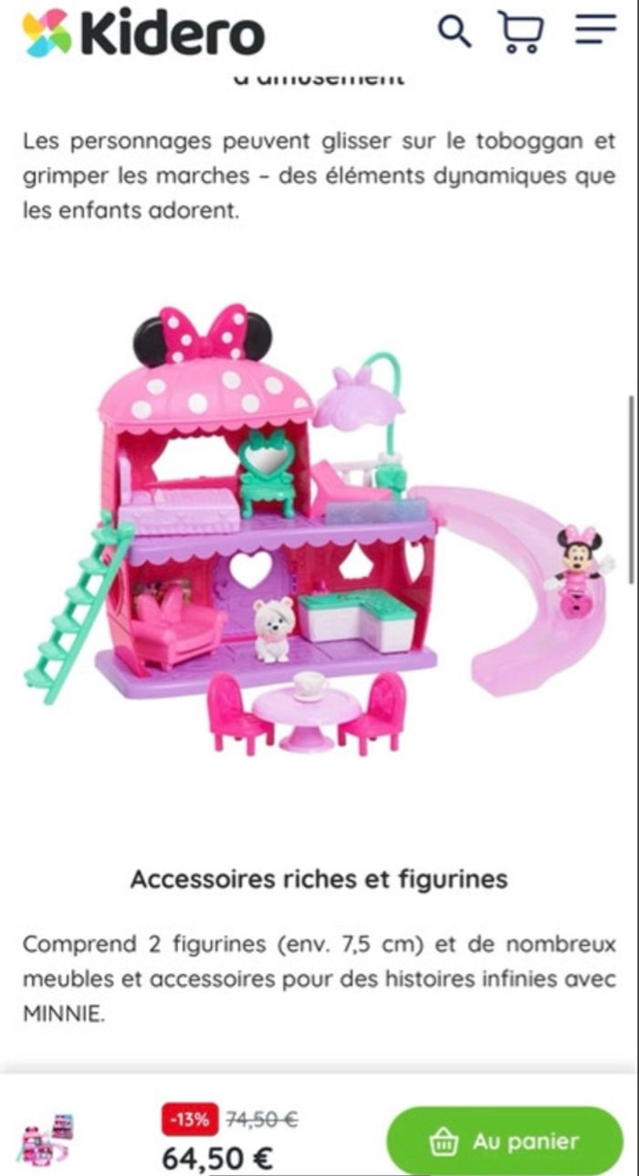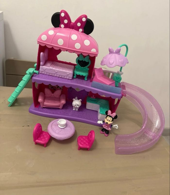 🎀 Maison Minnie Mouse – Complet (sans boîte) 🎀 Maison Minnie entièrement complète, sans boîte, en très bon état. Comprend : ✔️ 2 figurines (Minnie + animal) ✔️ Toboggan, échelle, lit, salon, cuisine ✔️ Table + chaises ✔️ Nombreux petits accessoires (meubles, déco…) Tout fonctionne et tout est propre. 💗 Parfait pour recréer l’univers de Minnie ! 💸 Prix neuf 64,50 € 📍 Remise en main propre possible 📦 Envoi possible