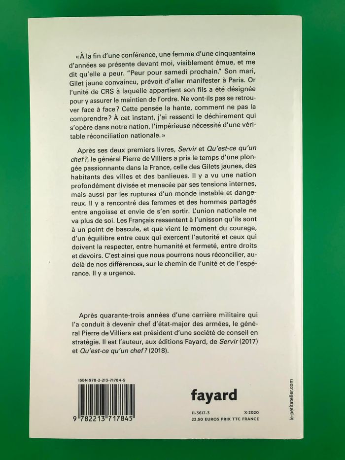 Après ses deux premiers livres, Servir et Qu’est-ce qu’un chef ?, le général Pierre de Villiers a pris le temps d’une plongée passionnante dans la France, celle des Gilets jaunes, des habitants des villes et des banlieues. Il y a vu une nation profondément divisée et menacée par ses tensions internes, mais aussi par les ruptures d’un monde instable et dangereux. Il y a rencontré des femmes et des hommes entre angoisse et envie de s’en sortir. L’union nationale ne va plus de soi. Les Français ressentent à l’unisson qu’ils sont à un point de bascule, et que vient le moment du courage, d’un équilibre entre ceux qui exercent l’autorité et ceux qui doivent la respecter, entre humanité et fermeté, entre droits et devoirs. C’est ainsi que nous pourrons nous réconcilier, au-delà de nos différences, sur le chemin de l’unité et de l’espérance. Il y a urgence.