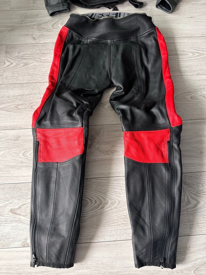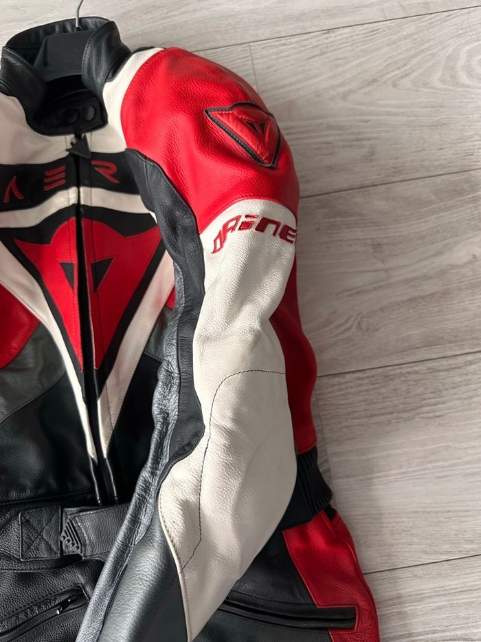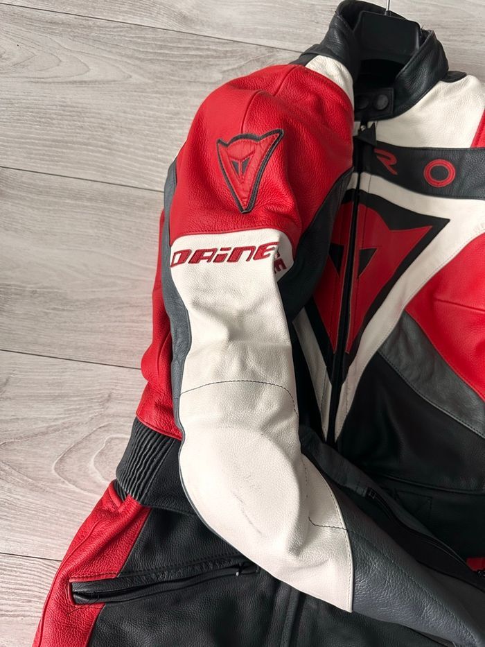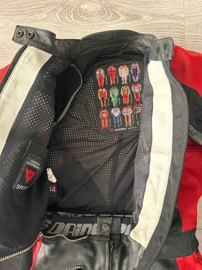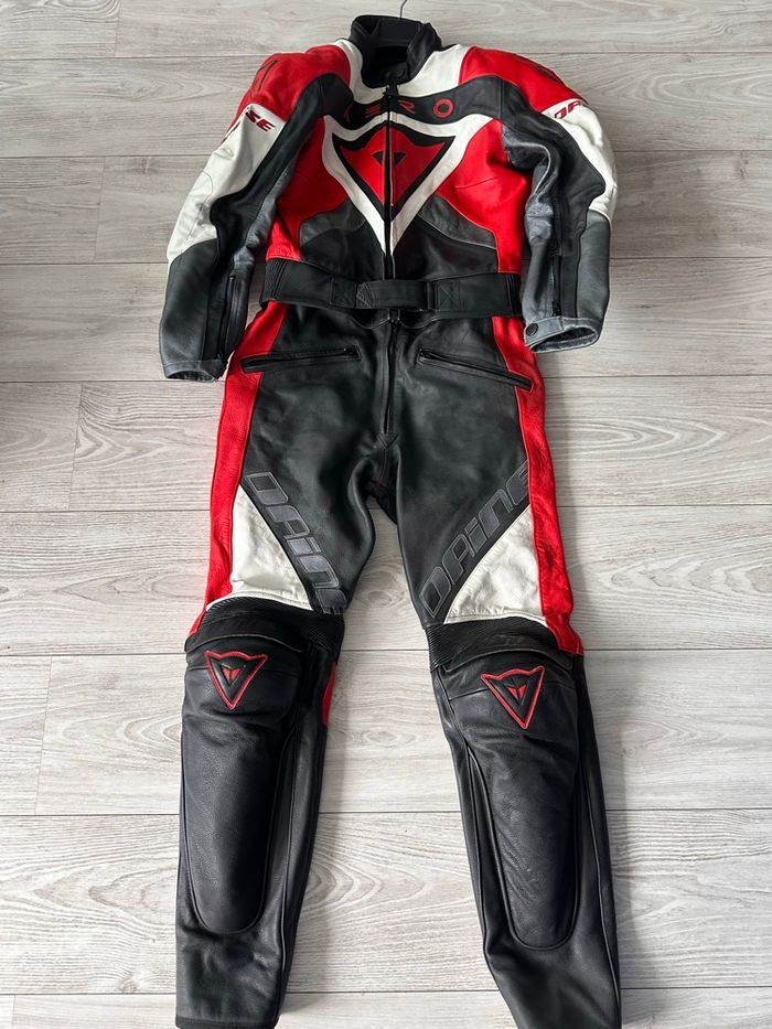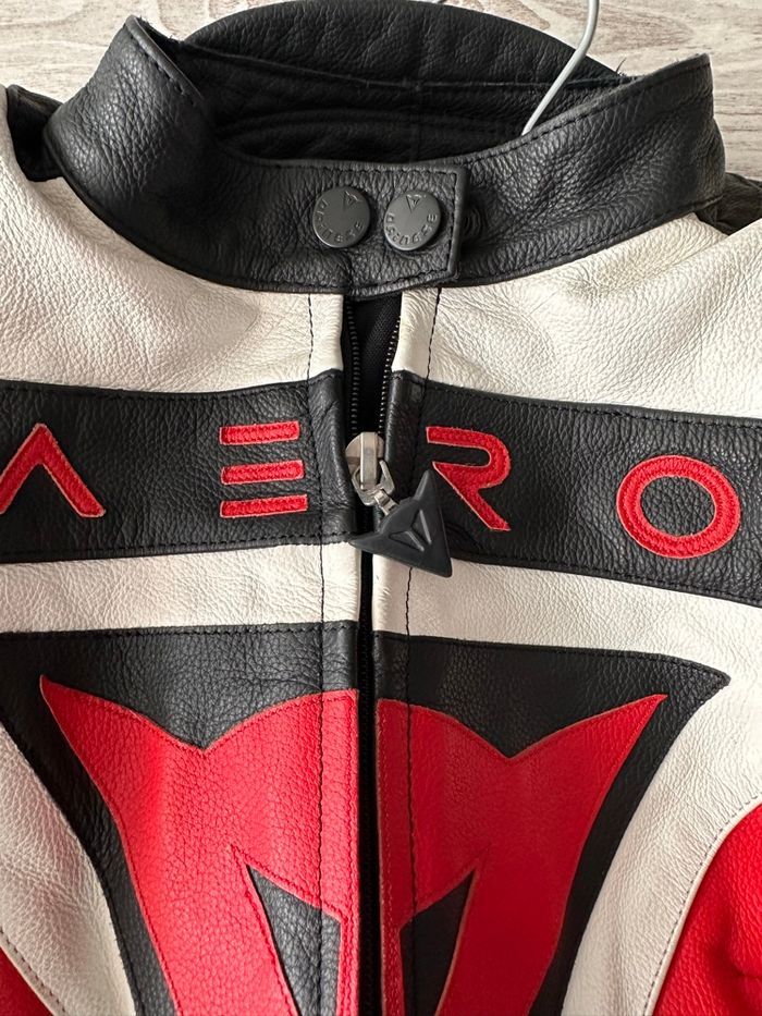 Ensemble moto cuir Piste Combinaison séparable Blouson et pantalon qui s'attachent entre eux Dainese aero Taille 44 italienne (34) Rouge noir blanc Très bon état
