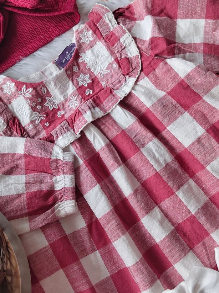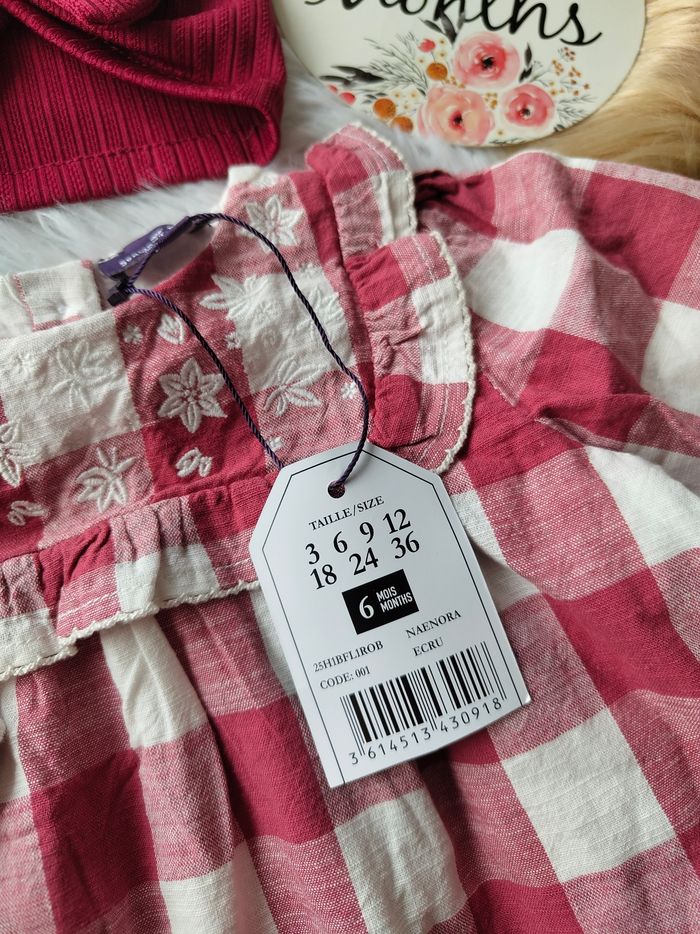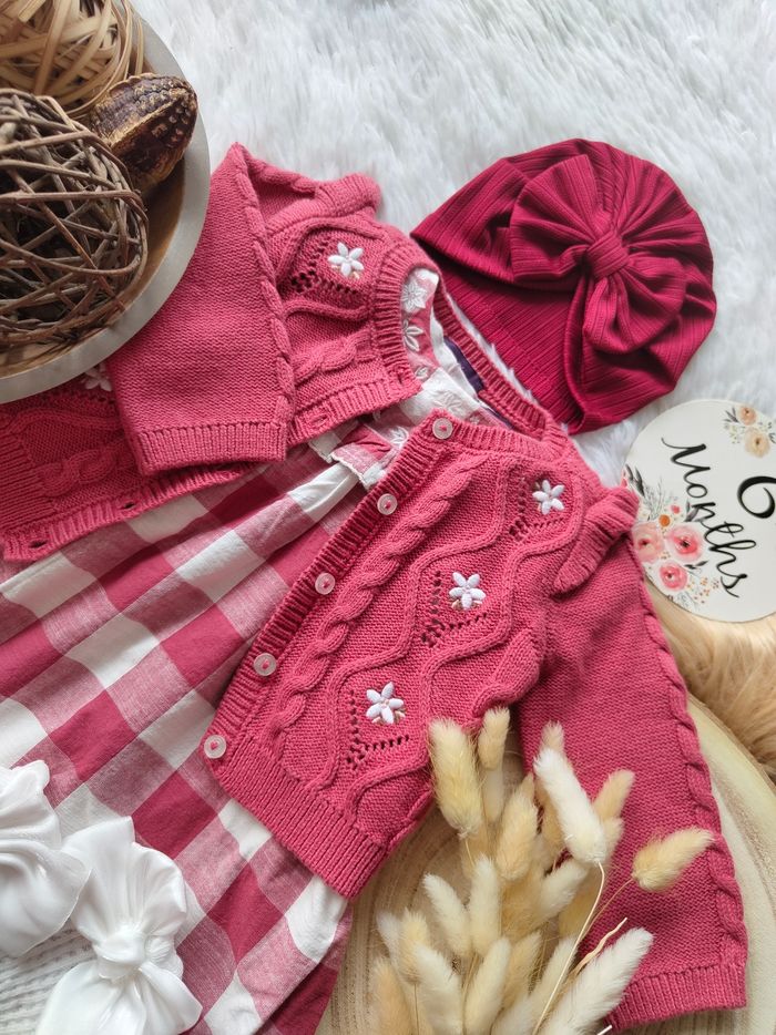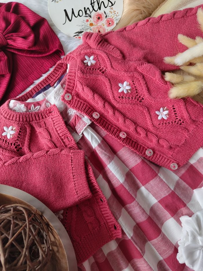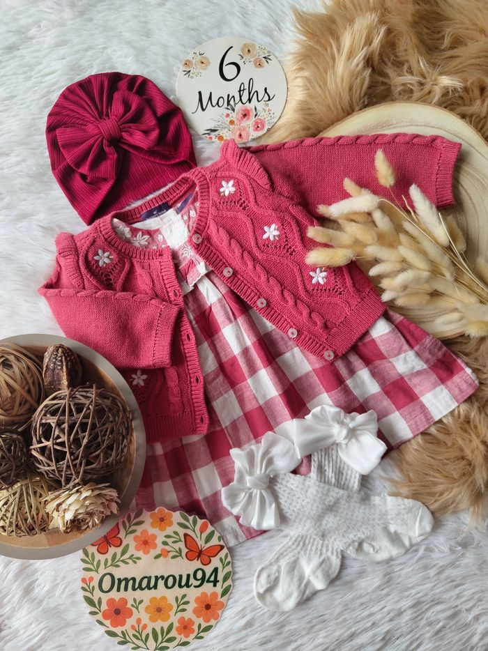 ✅ Gilet cardigan tricot broderie fleuri+ robe à carreaux blanc et rose à volants