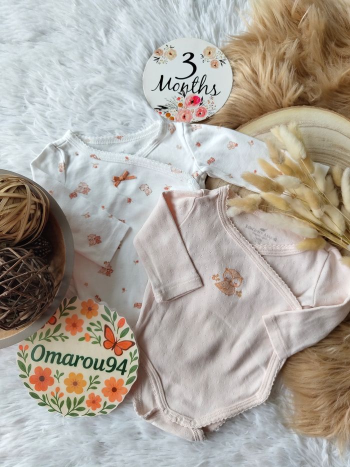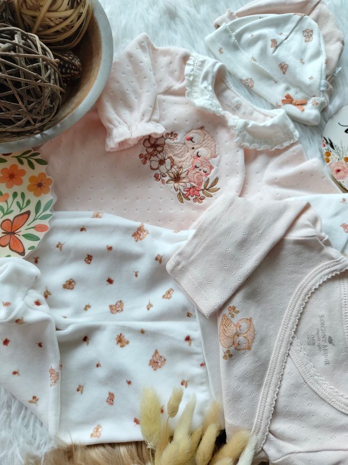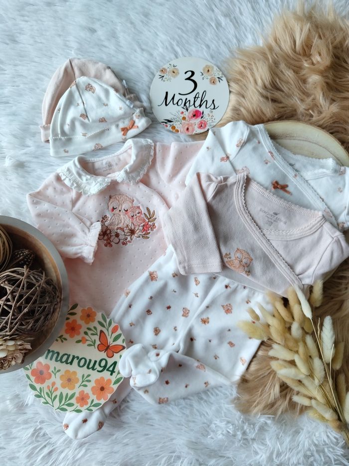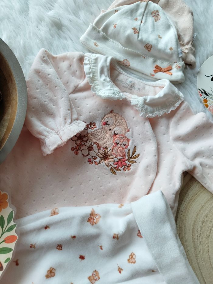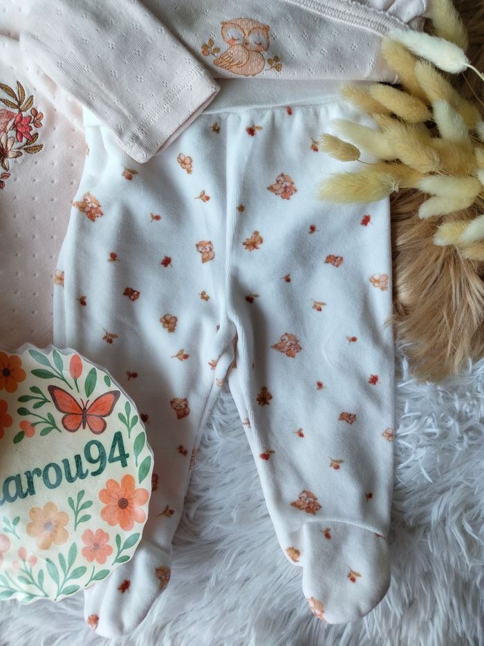 ✅ Ensemble naissance en velours col claudine broderie Hibou 🦉+ 2 bodies imprimé hibou et 2 bonnet