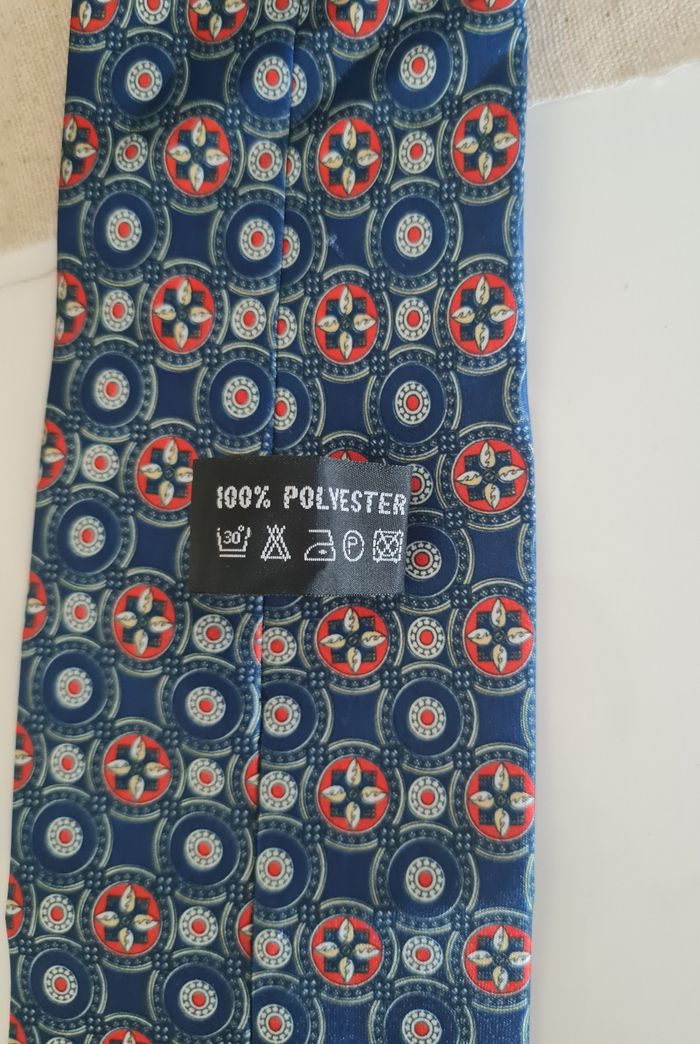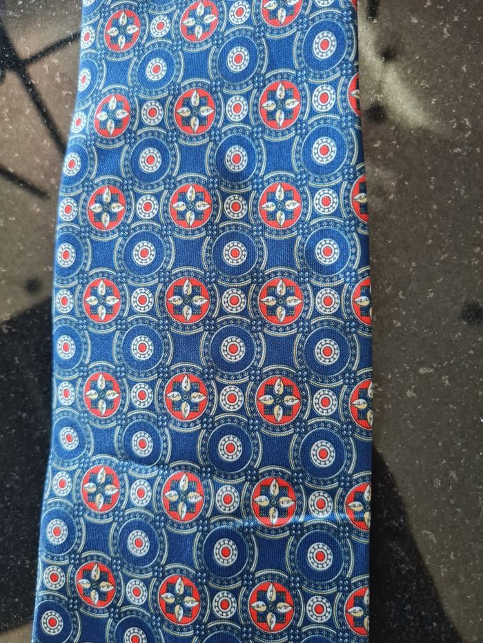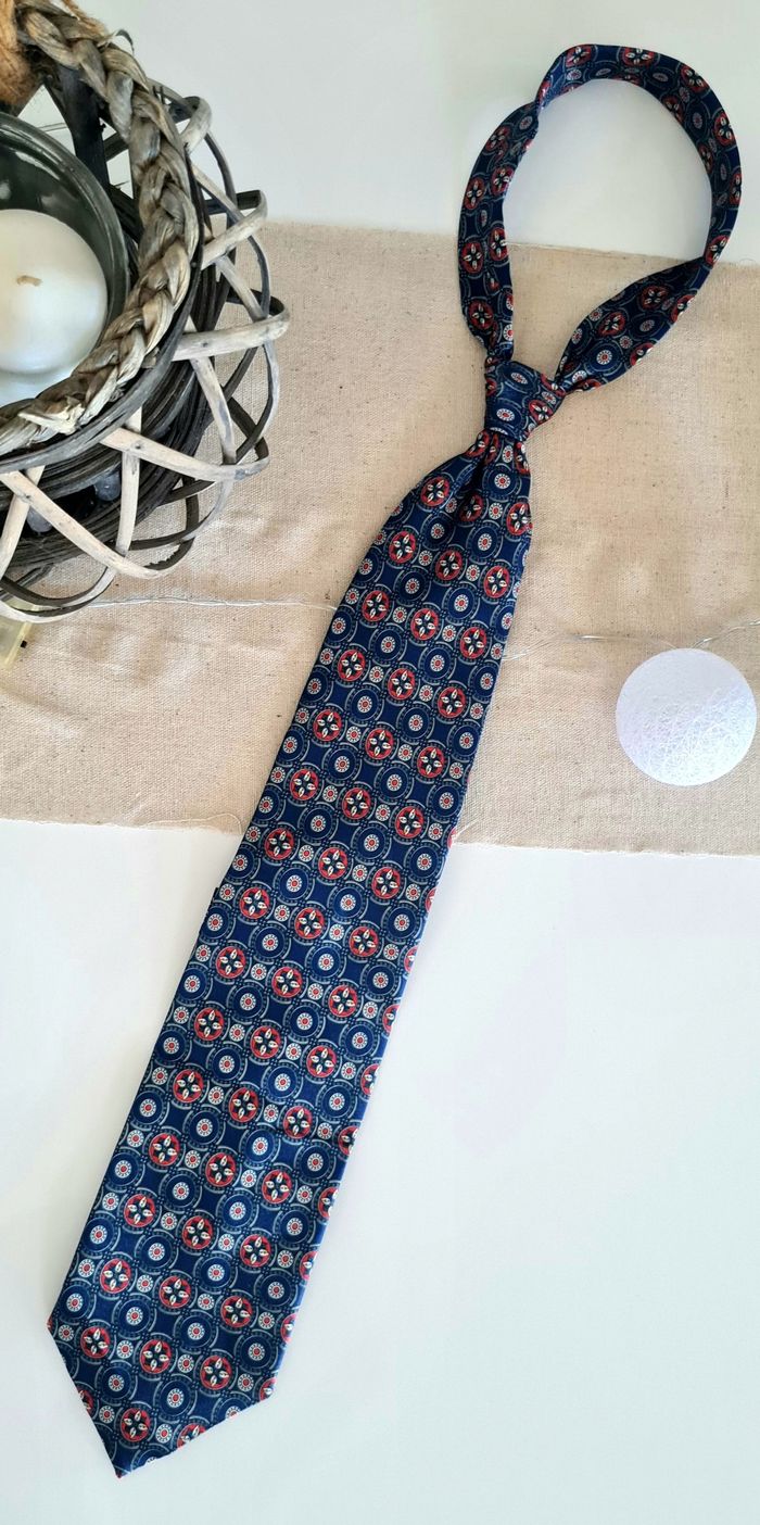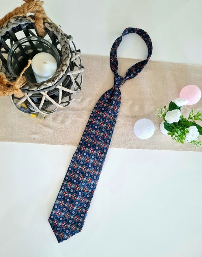 Couleurs : bleu marine avec motifs rouges et bleu clair, style floral géométrique.