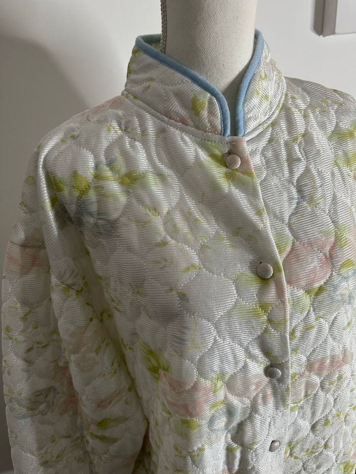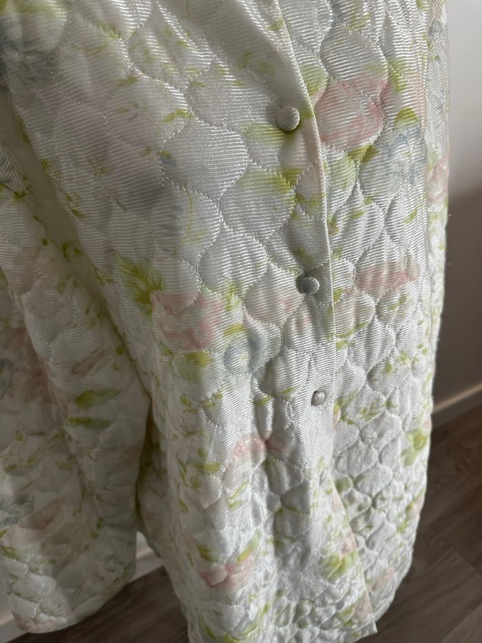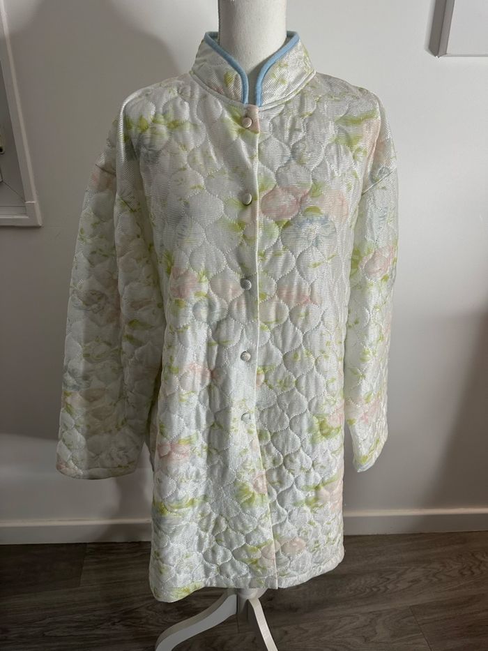 Peignoir robe de chambre - Excellent état - Taille L équivalent 40 Dimensions en bas de l’annonce - Coupe oversize - Blanc et multicolore - Marque Damart - Tissus matelassé légèrement satiné - Imprimés fleurs, pastel - Ultra douce et chaude - Se ferme avec des boutons - 100% Polyester Dimensions: - 60cm niveau épaules - 70cm niveau aisselles - 87cm de long