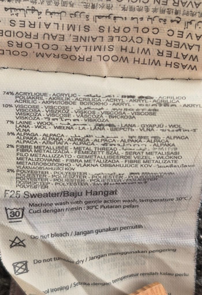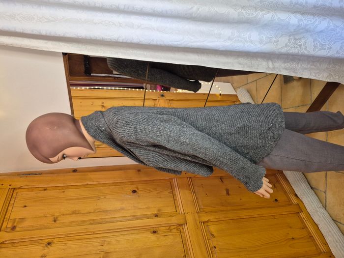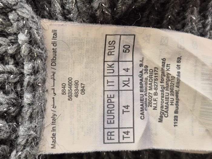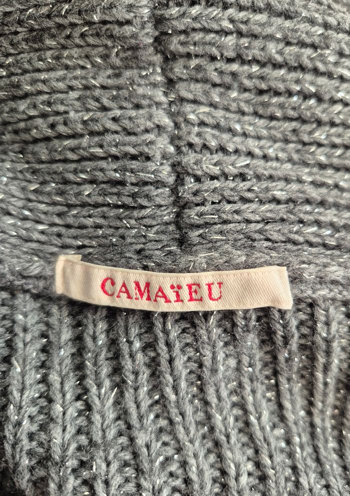 Kimono #Camaïeu, taille XL Gris pailleté argent, grand col, maille 74% acrylique, 10% viscose, 7% laine, 5% alpaga, 2% fibre métalisée, 2% polyester Dimensions à plat: épaule 42 cm., sous aisselle 42 cm. Hauteur 70 cm.