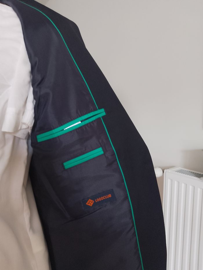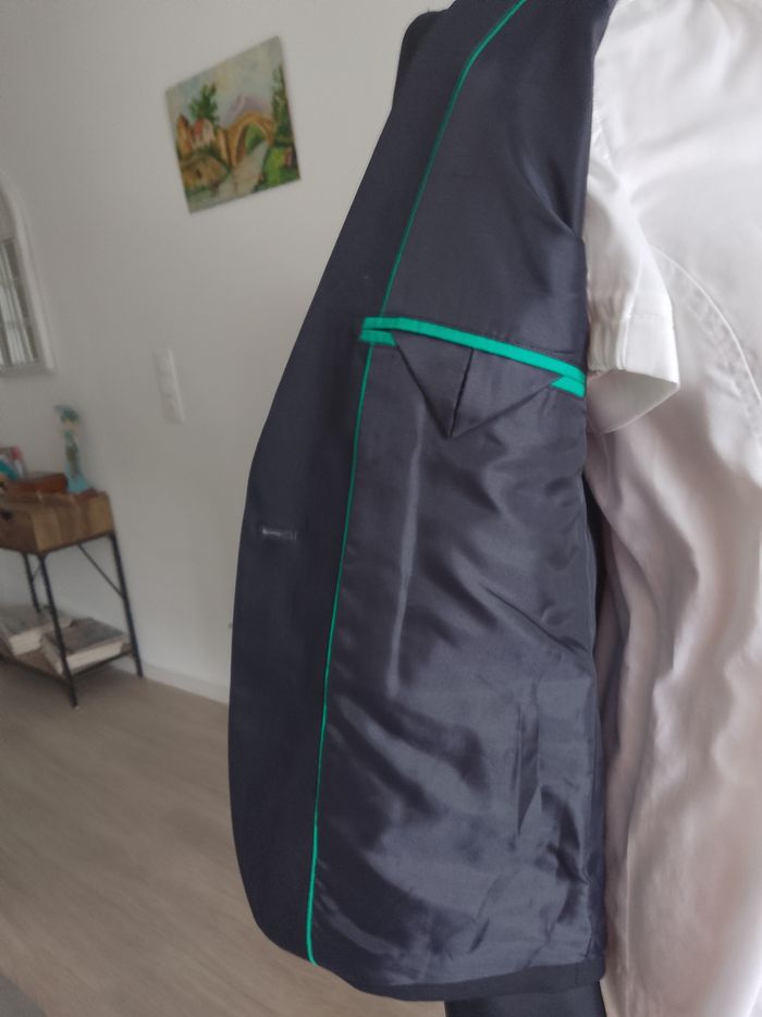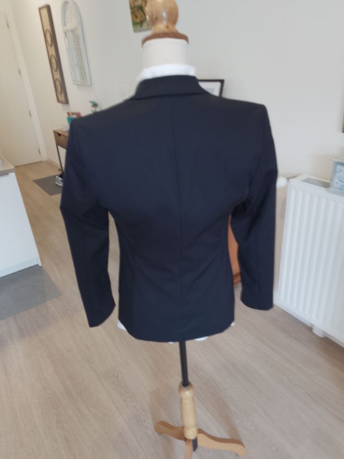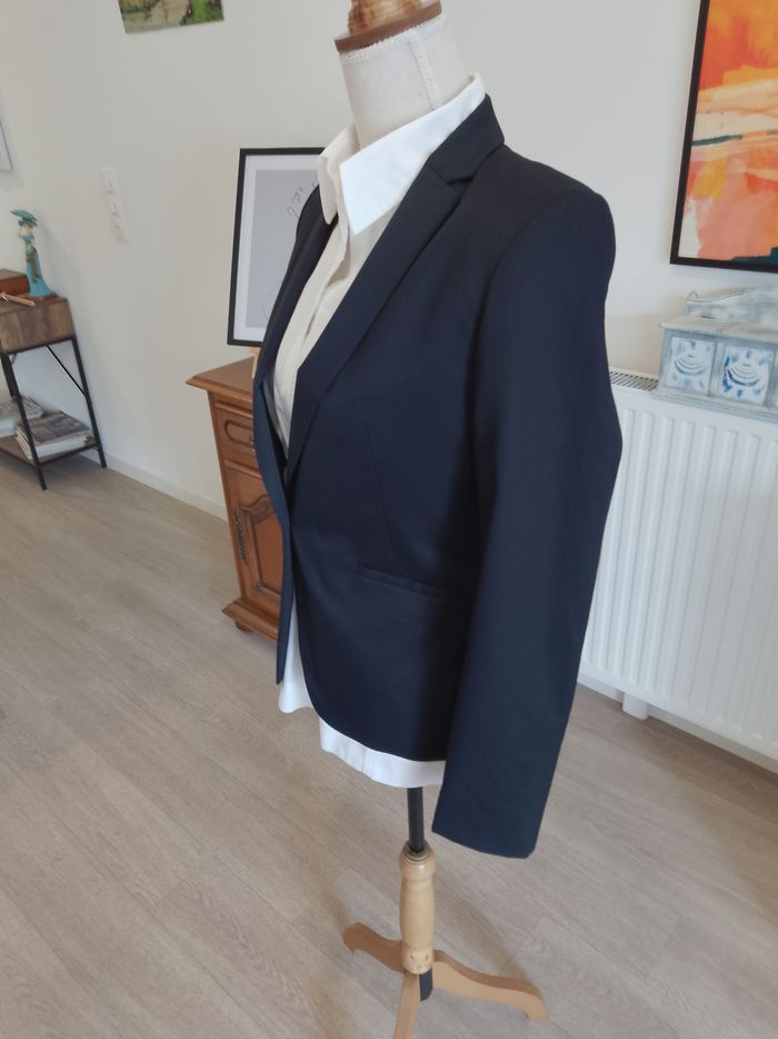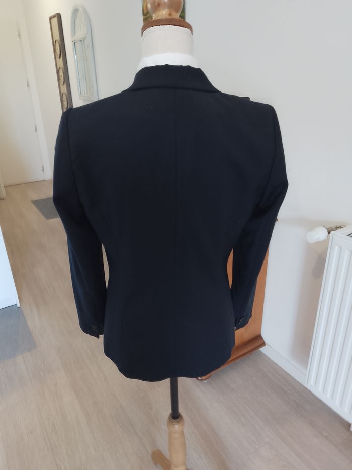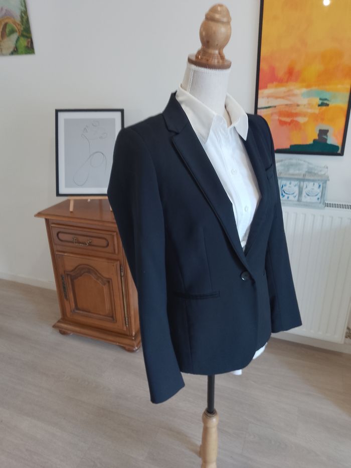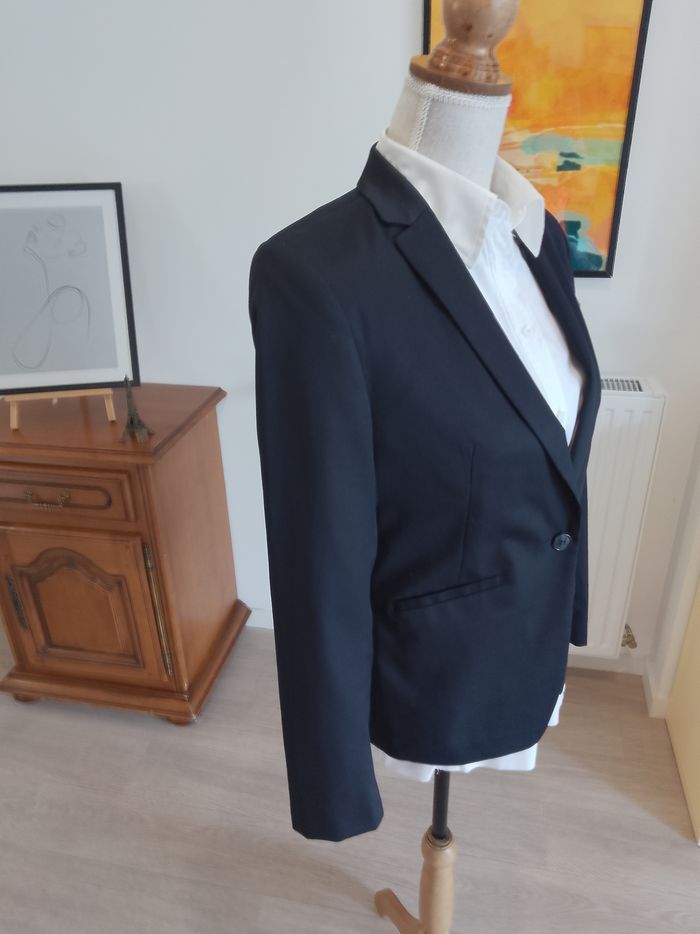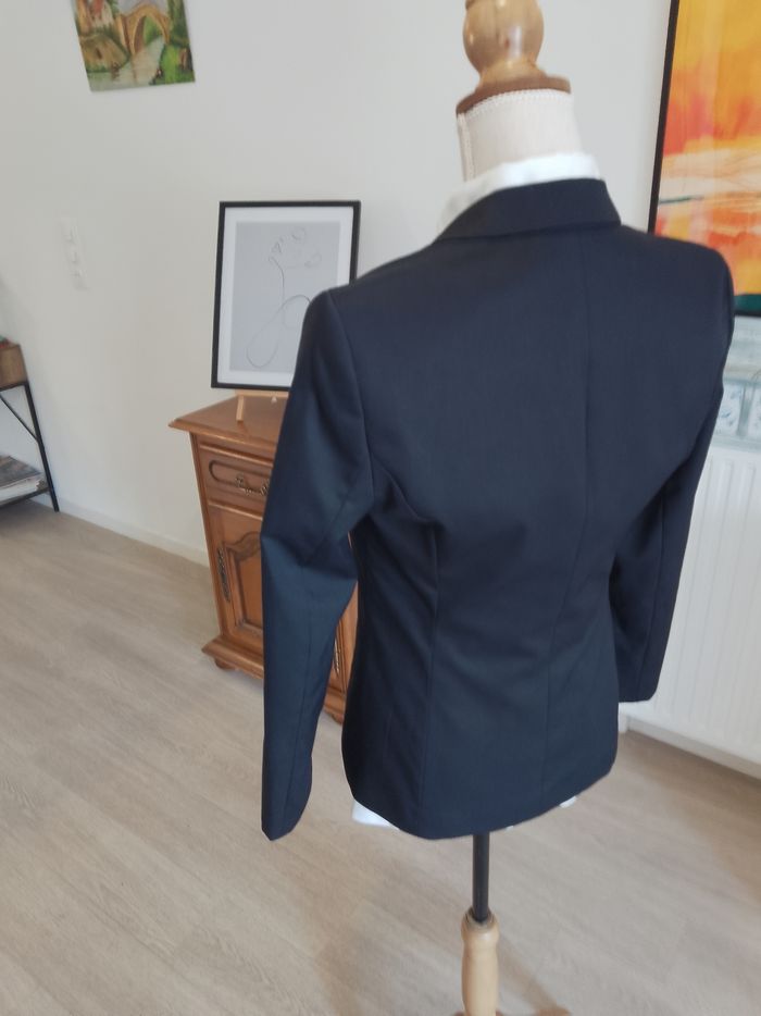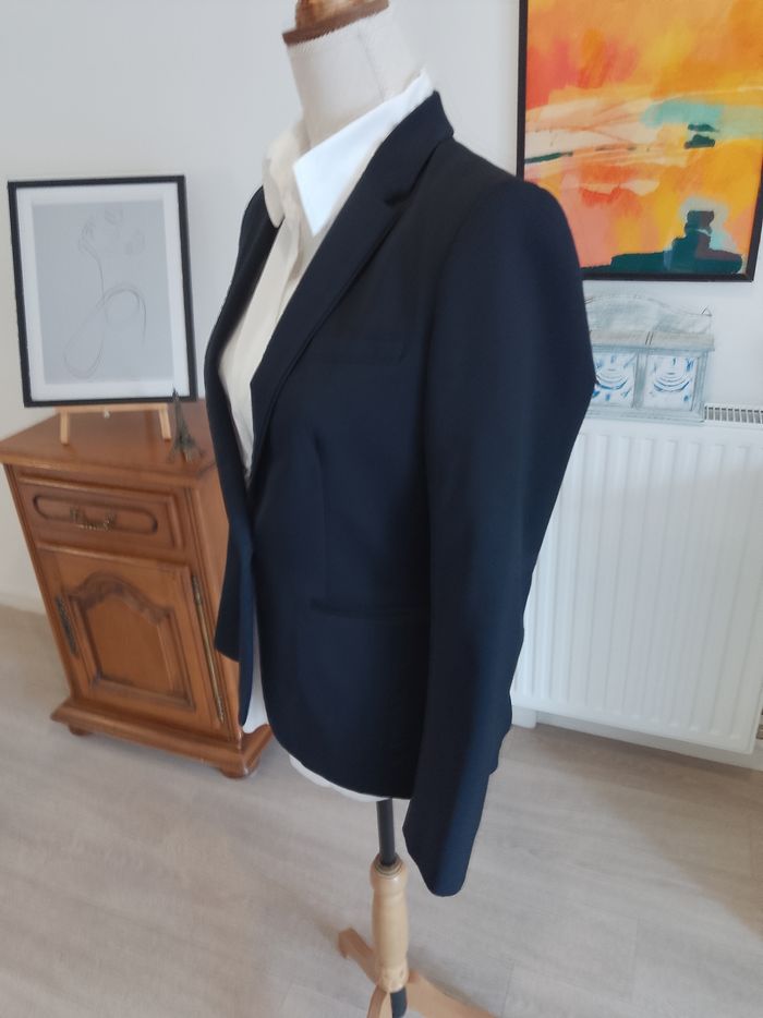 Blazer court bleu marine, toutes saisons, femme, 3 poches intérieures, 3 poches extérieures non décousues, hauteur totale: 68 cm, longueur des manches: 61/41 cm, aisselle à aisselle: 43 cm, taille à la ceinture: 40 cm, '' Logoclub'', T: S/36/8, jamais porté, aucun accrocs, aucune tâches, neuf sans étiquettes, très bon état, prêt à porter.