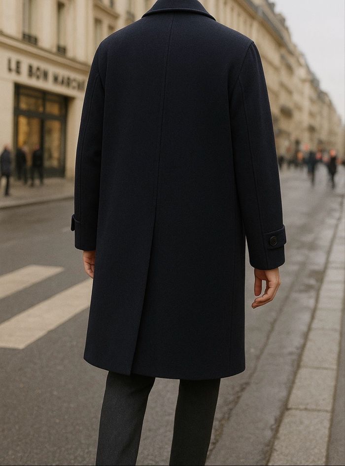 Ce manteau Oxford, en laine ou mélange lourd, offre une coupe élégante et fluide qui convient aussi bien aux hommes qu’aux femmes. Sa doublure intérieure chaleureuse (visible sur photo) garantit confort et maintien même par temps frais.
