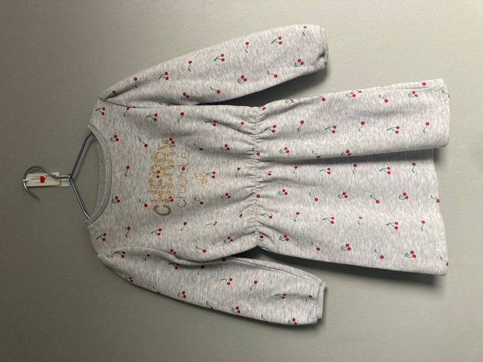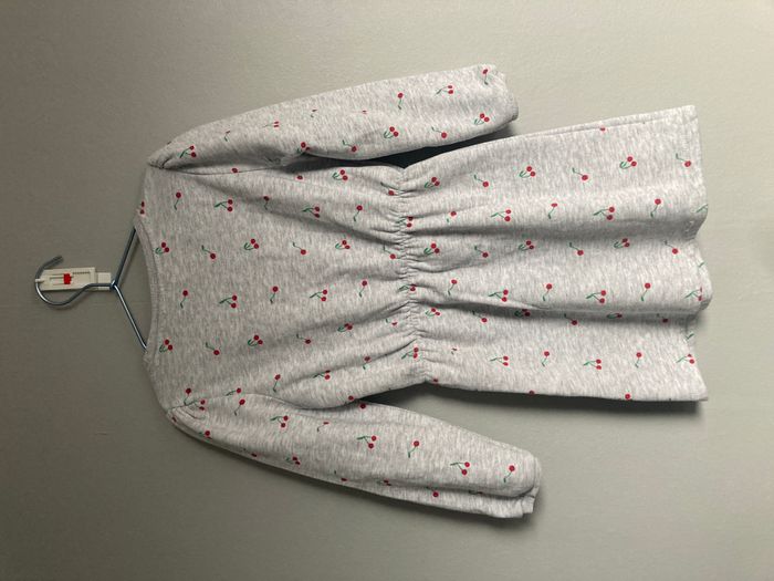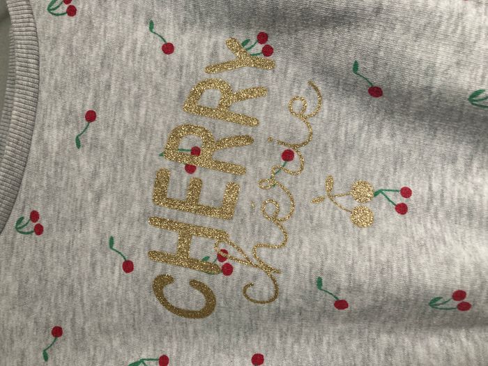 Jolie robe sweat pour fille de la marque Kiabi, taille 6 ans (114/119 cm). Gris chiné et un charmant imprimé cerises avec l'inscription "Cherry chérie" en doré. Manches longues et taille élastiquée, coupe est facile à porter. Portée très peu, elle est en très bon état, sans défauts, et est parfaite pour l'école comme pour le quotidien.
