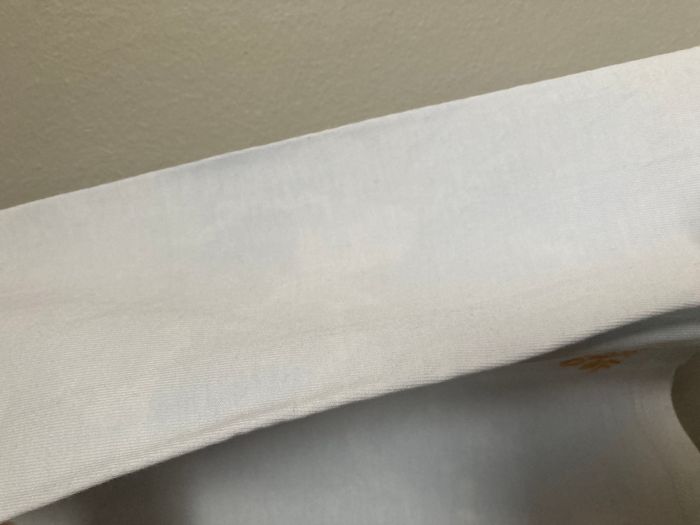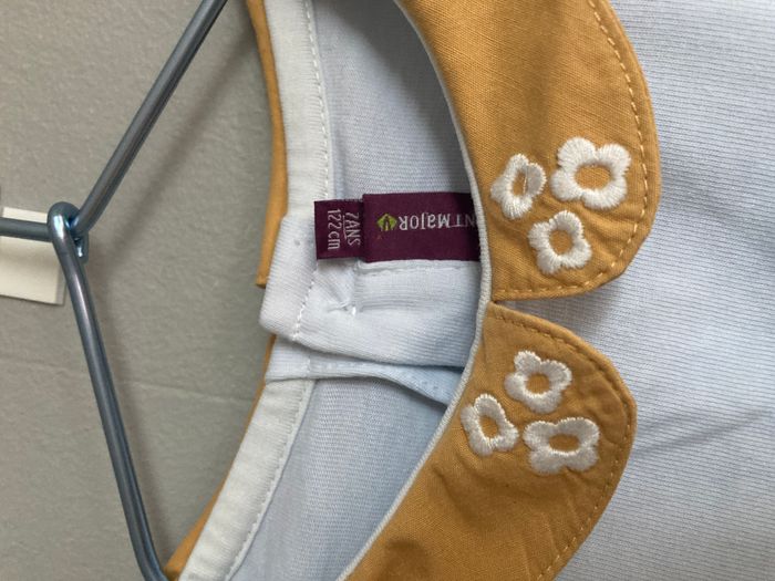 T-shirt à manches longues pour fille de la marque Sergent Major, taille 7 ans (122 cm). Col Claudine couleur moutarde orné de petites broderies florales. Le vêtement est en bon état général, sans trous ni déchirures, mais présente des taches (voir photos) qui ne sont pas parties au lavage classique. Pour cette raison, le prix est fixé très bas. Parfait pour le quotidien ou les loisirs. Idéal à porter avec un pull ou un sweat par-dessus, afin de laisser le col décoratif visible tout en masquant les taches.