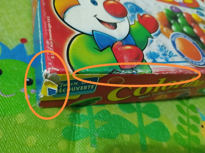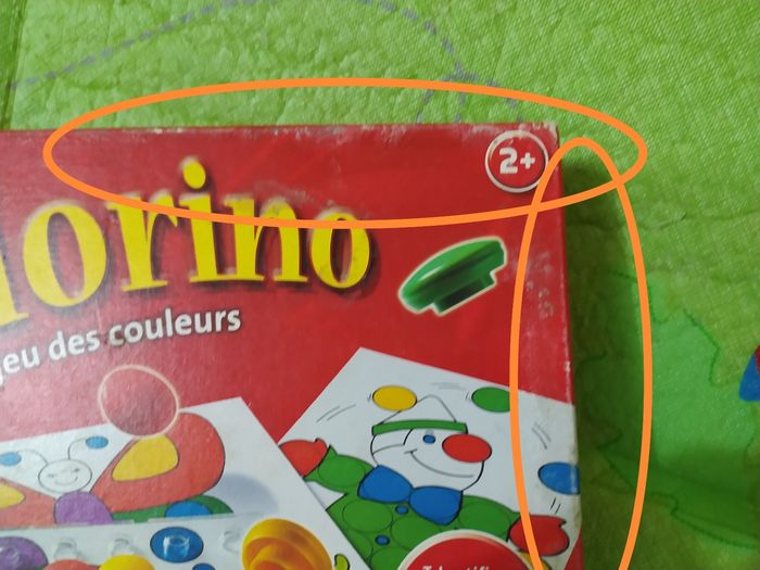 boite d'origine (abîmée aux coins et tranches, traces sèches d'humidité (ne sens pas), voir ronds oranges);