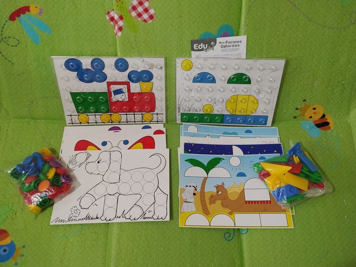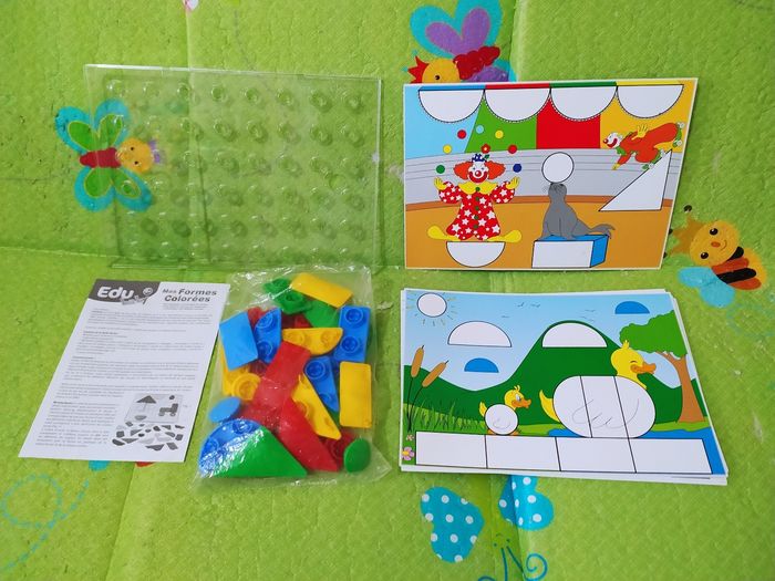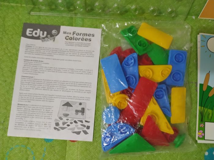 29 formes colorées (triangle, rectangle, rond, demi-lune), de 3,5 à 8 cm,
