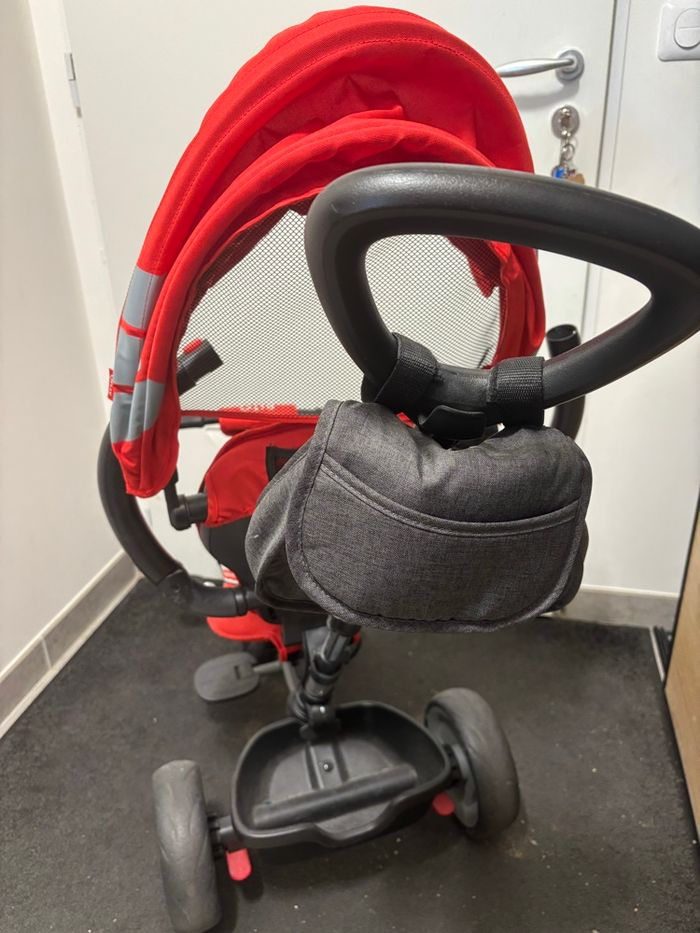 De couleur rouge et noir il est vendu avec la petite prochette derrière. Le manche derrière permet au parents de guider l’enfant, mais il est possible que l’enfant puisse tourner le guidon lui même.