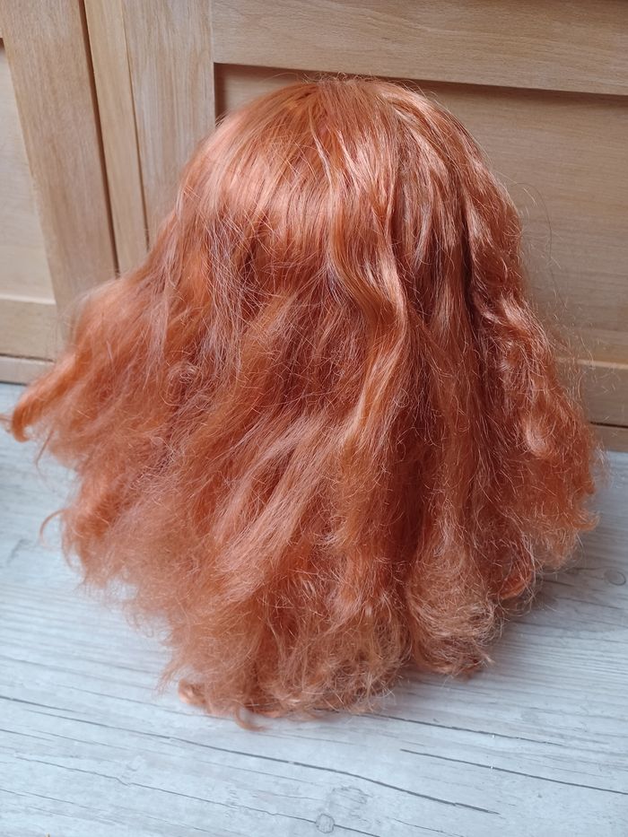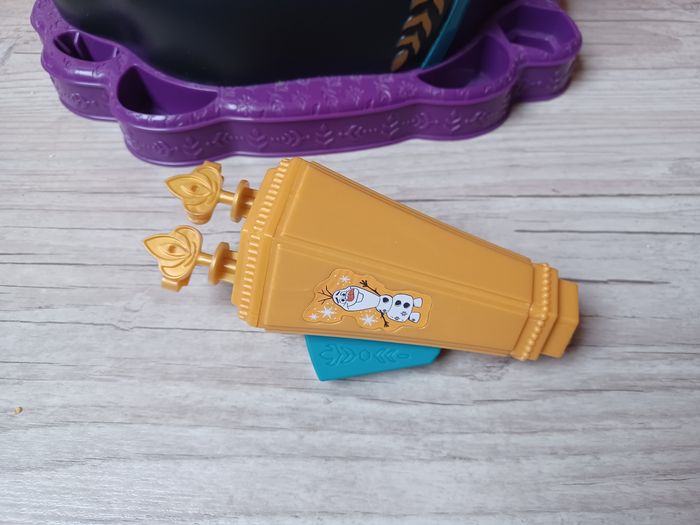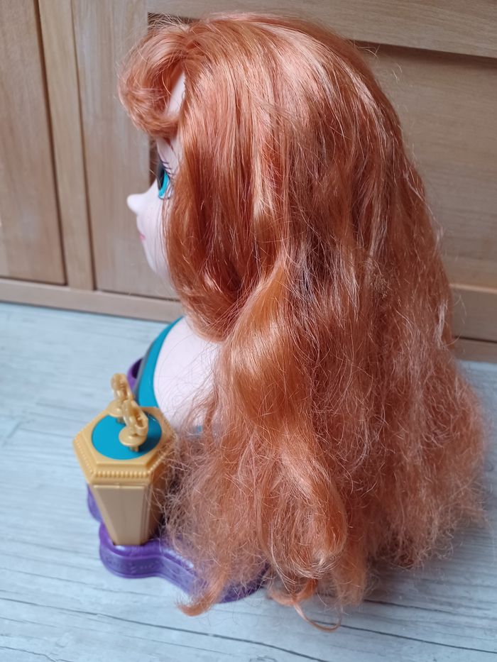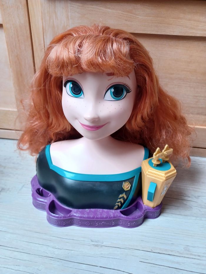 Tête à coiffer, Anna de la reine des neiges, Disney. Avec le petit appareil qui permet de lui faire des coiffures, accrocher les mèches pour les torsader ensemble. La tête à coiffer est en très bon état, les cheveux ont servi et ne sont donc plus aussi lisses qu'au départ sur le bas (photo 2).