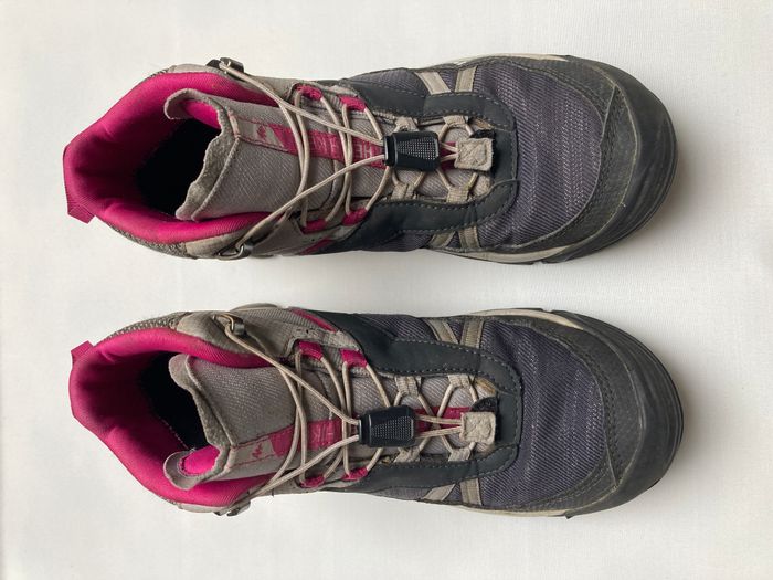 Chaussures de randonnée Quechua Crossrock Mid (Décathlon), taille 35. Ce modèle est imperméable, robuste et très confortable, idéal pour les activités en extérieur. Elles offrent un bon maintien de la cheville, une semelle adhérente adaptée aux terrains variés et un système de laçage rapide très pratique. En très bon état général, elles sont parfaites pour les randonnées, les sorties scolaires en plein air ou les balades en nature.