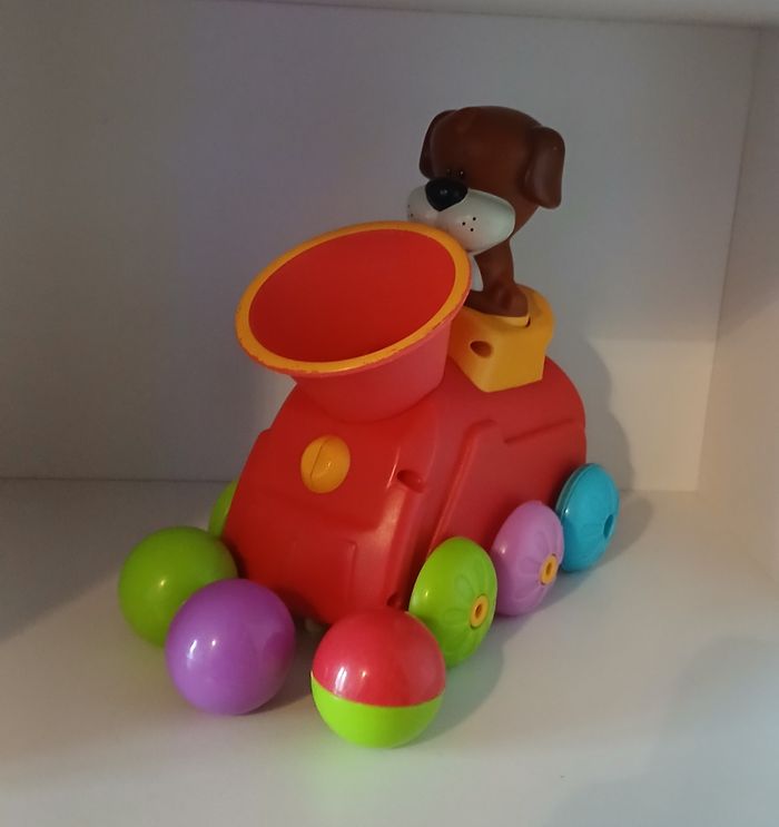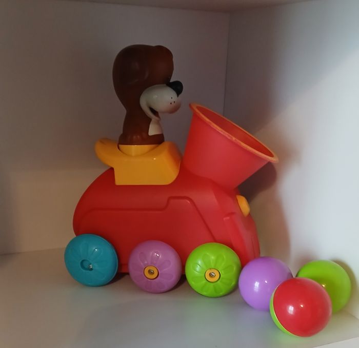 Cette locomotive avance en musique grâce aux balles que l'enfant glisse dans la cheminée.