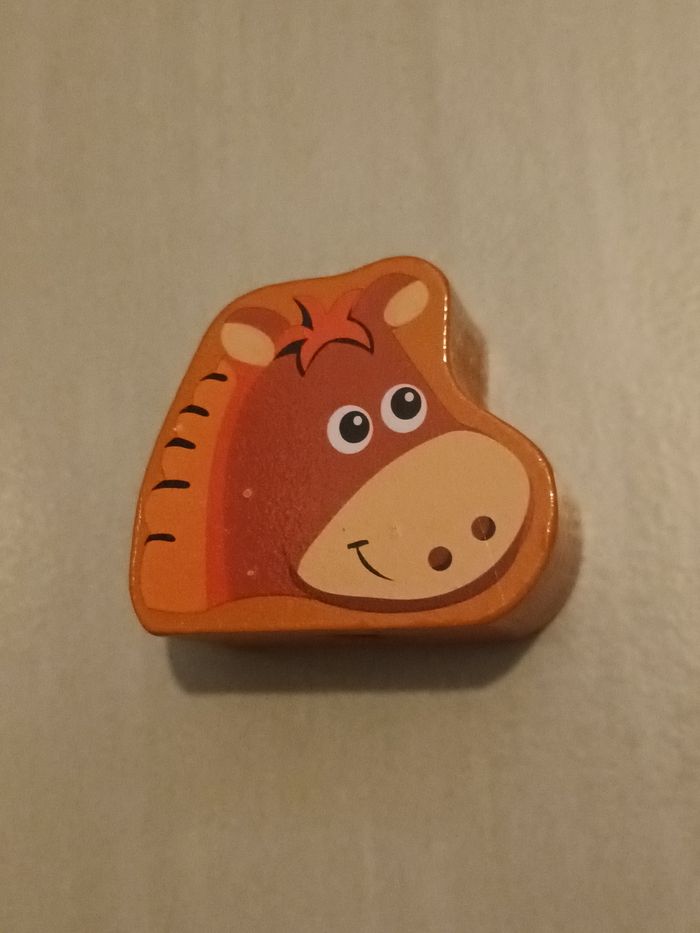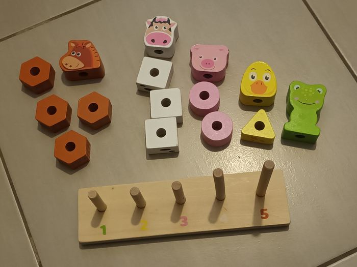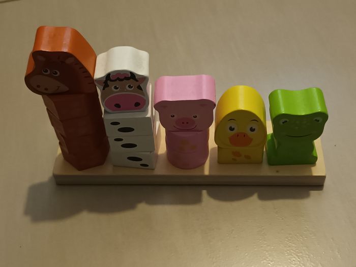 Jouet d'assemblage en bois en bon état. Quelques défauts (voir photos) mais qui ne gênent en rien à l'utilisation du jouet.
