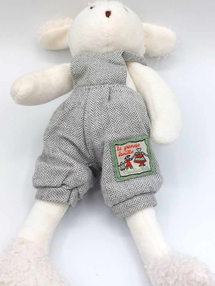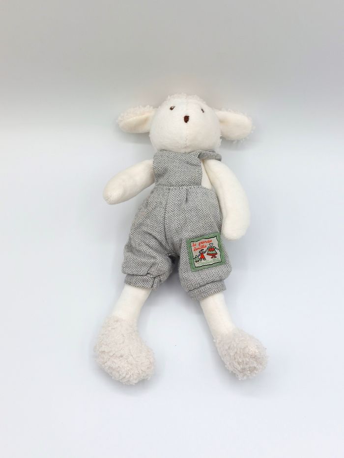 Doudou peluche mouton blanc écru MOULIN ROTY la grande famille salopette gris 22 cm