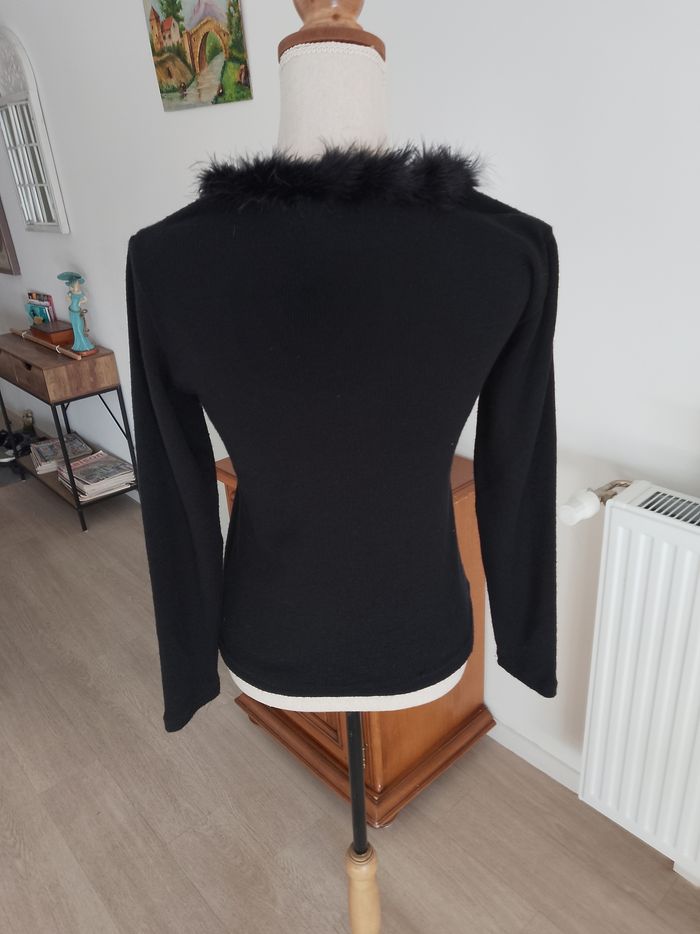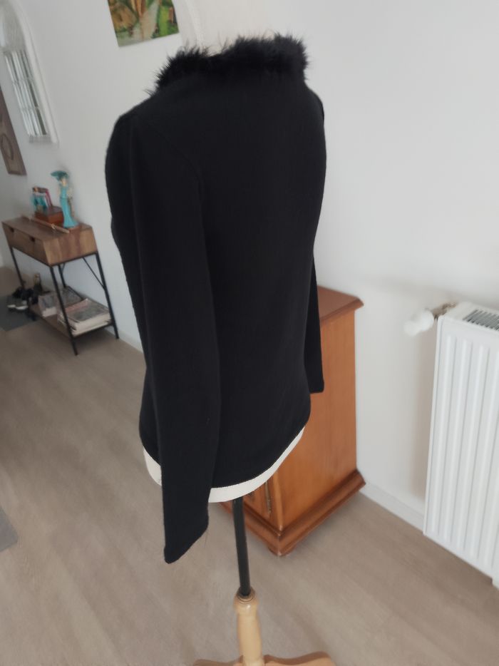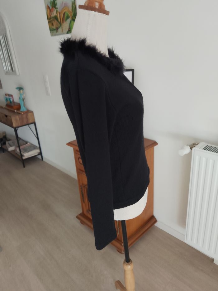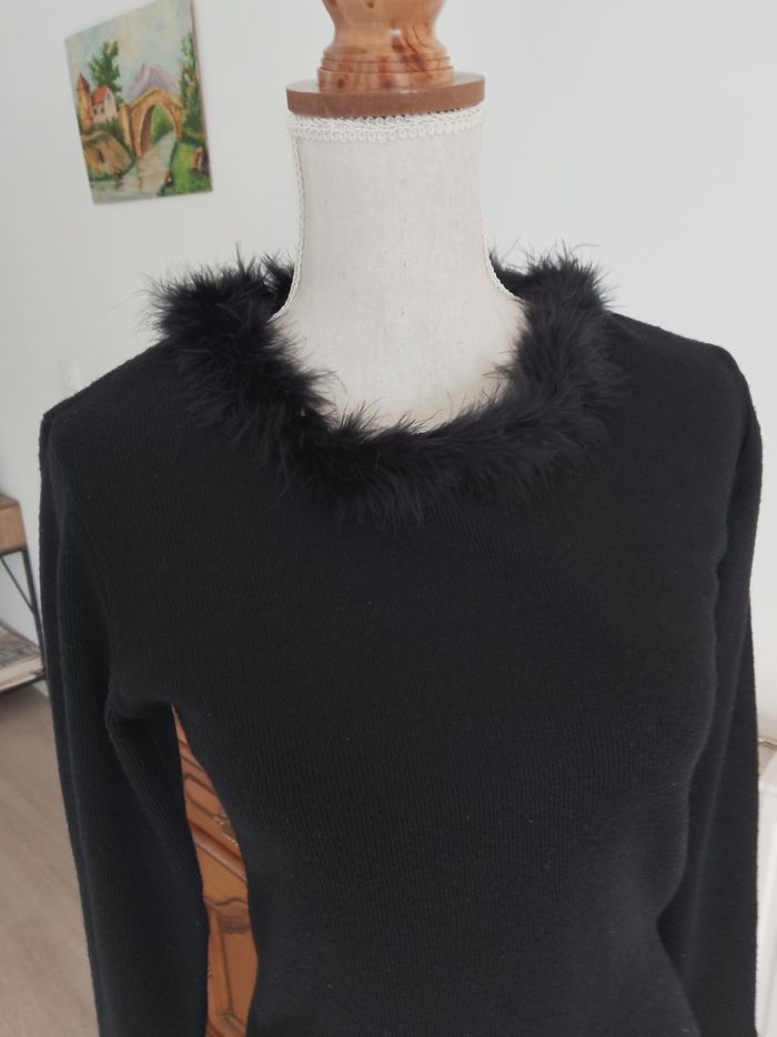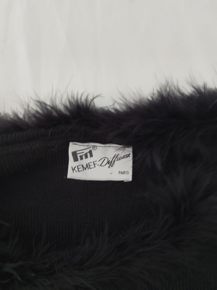 Pull noir raz du cou, col bordé d' une fourrure noire, toutes saisons, femme, manches longues: 58/47 cm, hauteur totale : 55 cm, largeur base: 45 cm, aisselle à aisselle : 46 cm, '' FM/ Kemef diffusion'', T: 38, porté quelques fois, aucun accrocs, aucune tâches, (lavé, non repassé), très bon état, prêt à porter.