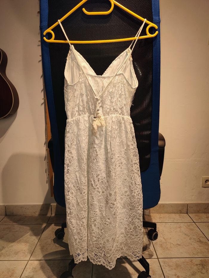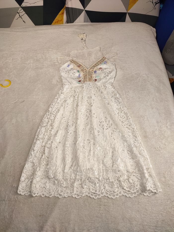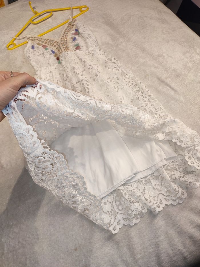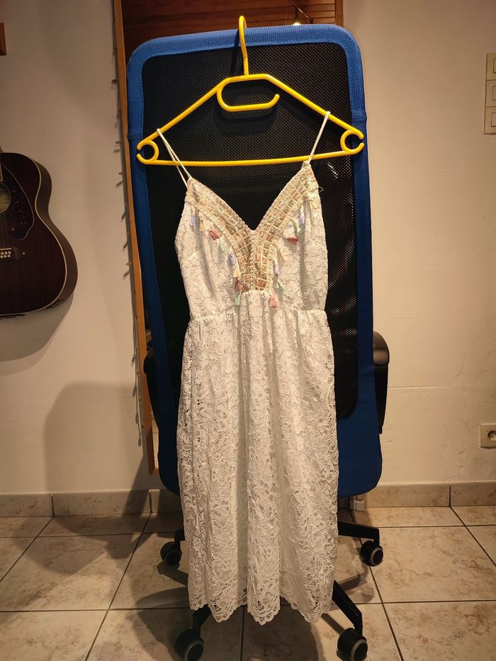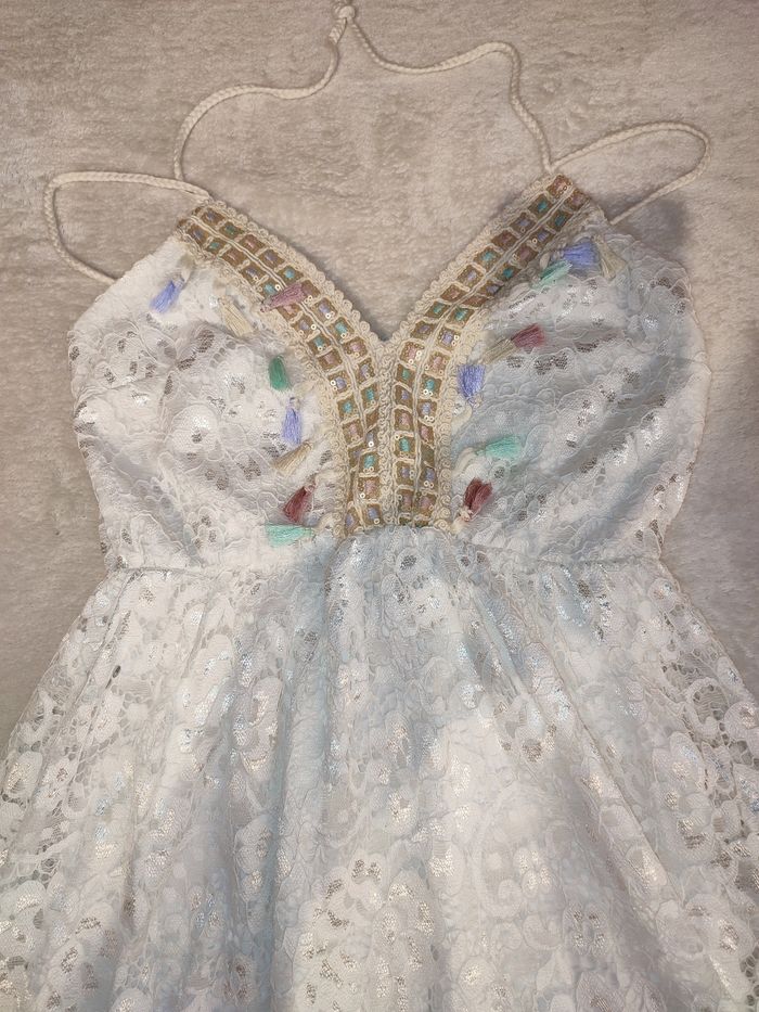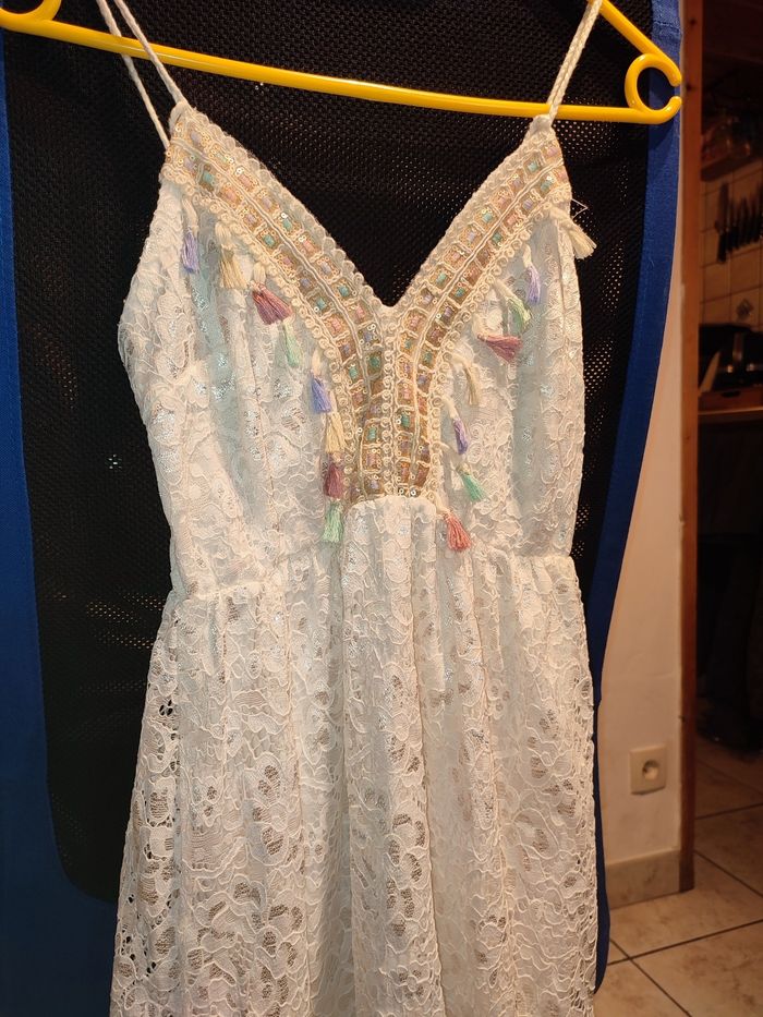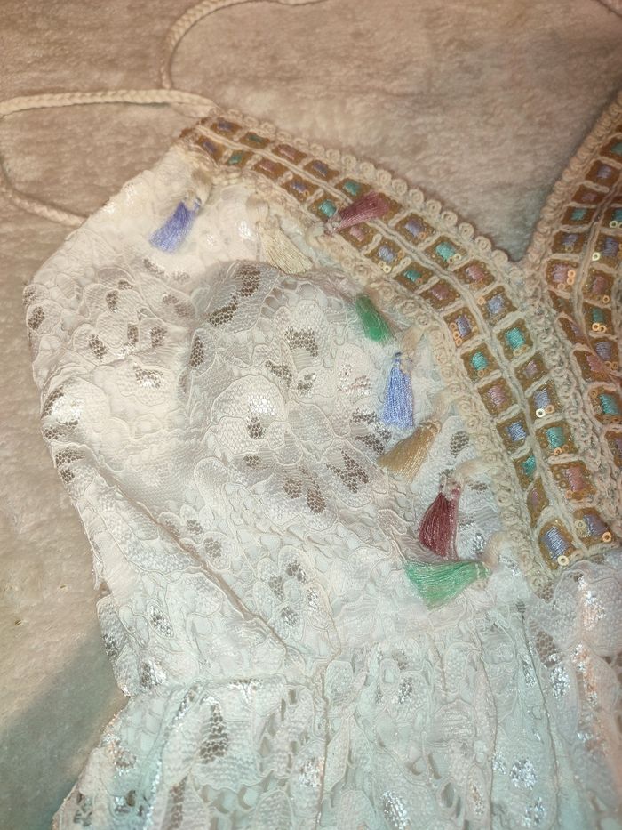 Je vends cette belle robe style Hippie chic. Couleur blanche, doublée avec surcouche en dentelle. Décolleté en V. Très belles finitions 🥰 Taille 38, la taille des bretelles est ajustable. Effet ceintré et élastique en dessous de la poitrine Longueur 90cm Jamais eu l'occasion de la mettre, elle est neuve aucun défaut à signaler 👌