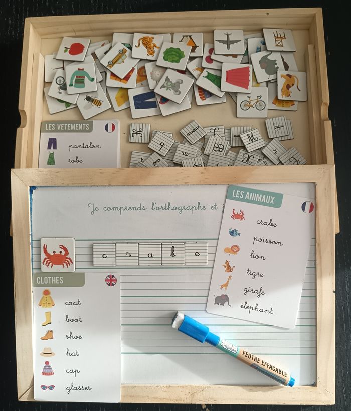Comprend des fiches de mots en français et en anglais, des lettres aimantées en cursive majuscules et minuscules et des aimants images
