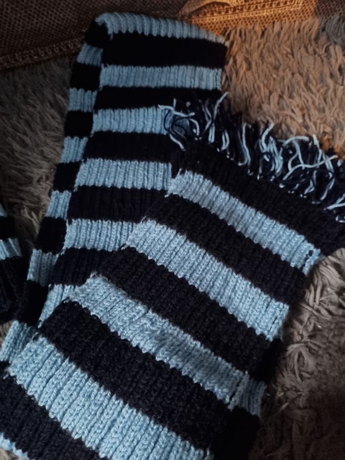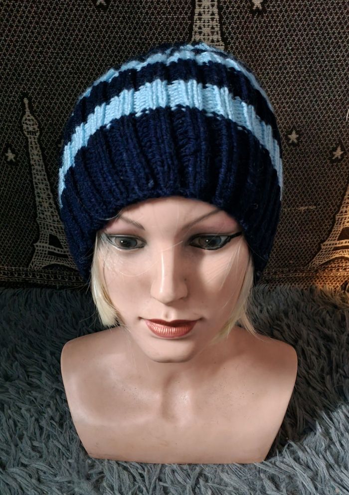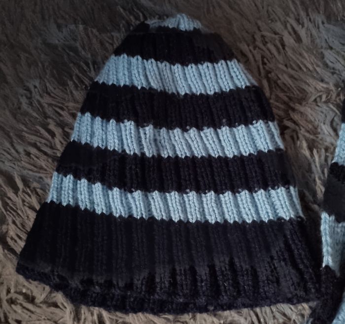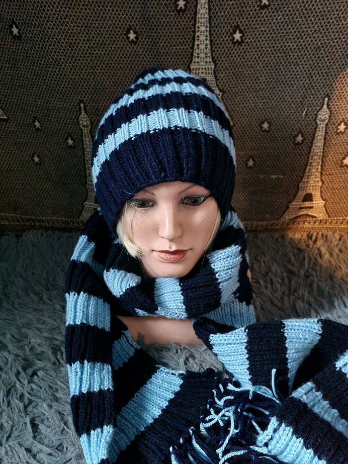 Ensemble bonnet + écharpe à rayures marine et bleu clair, taille Unique.