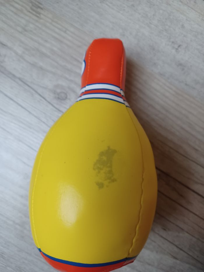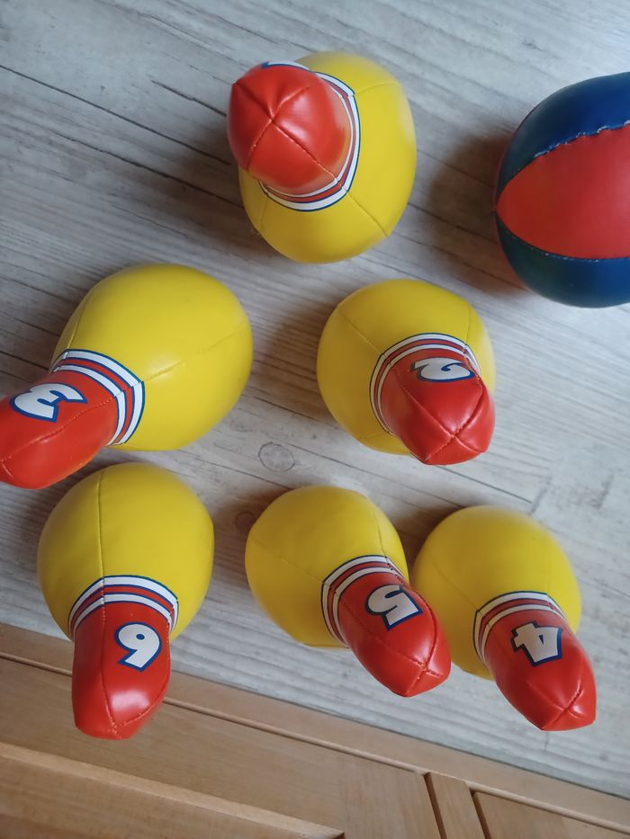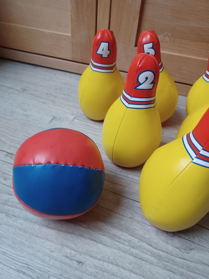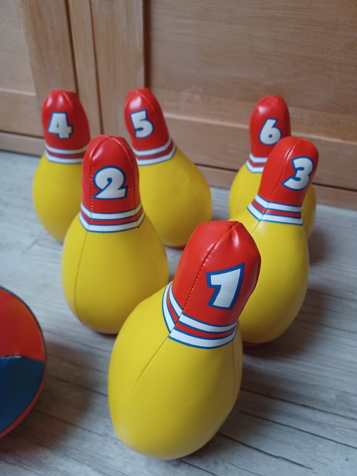 Jeu de bowling : 6 quilles numérotées de 1 à 6 (15cm de hauteur) et 1 balle. Le tout est en tissu simili cuir, ce qui permet d'éviter tout danger et adapte le jeu aux plus petits.